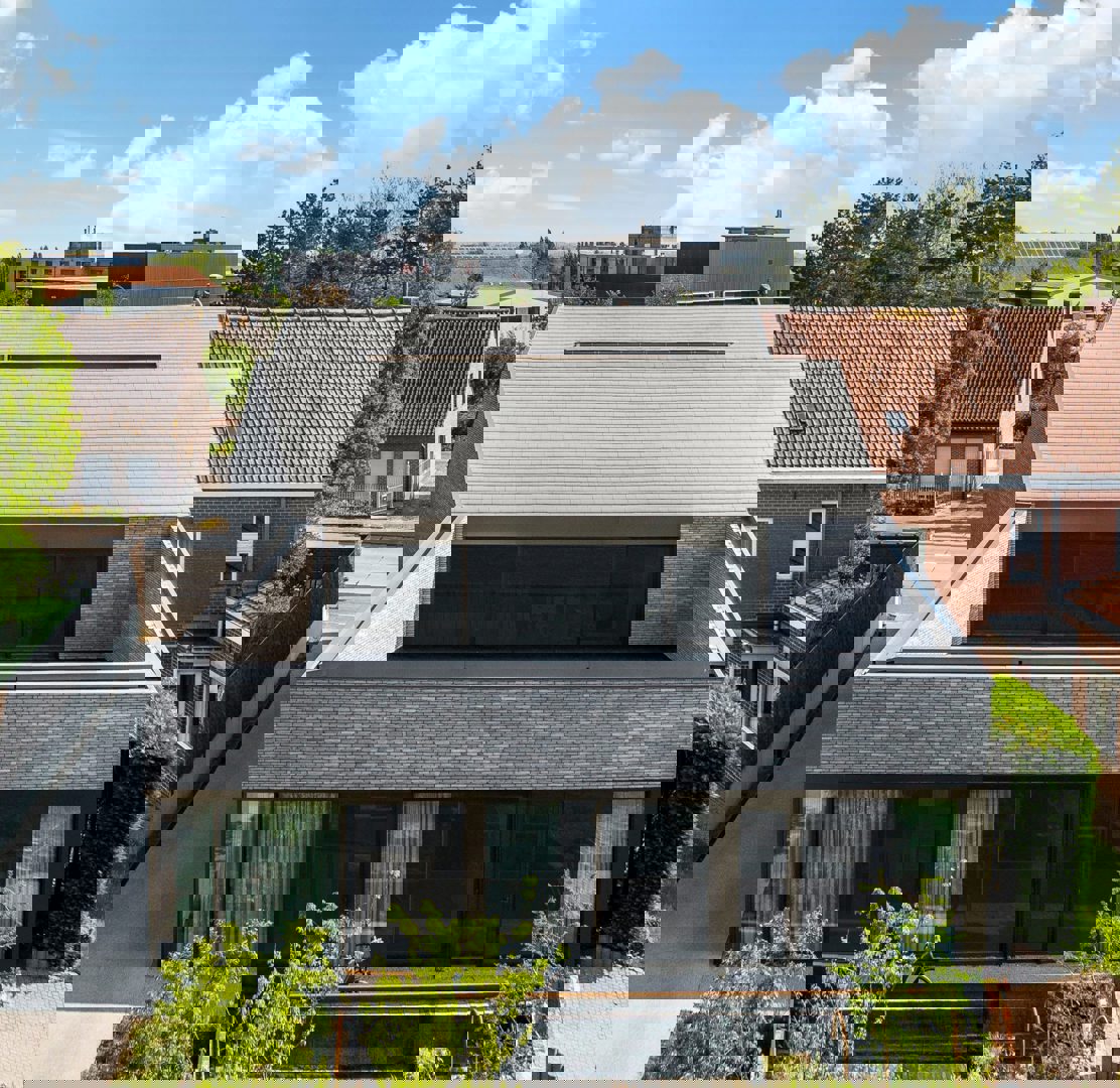 Aan de straatzijde sluit de dakhelling naadloos aan op het profiel van de aanpalende bebouwing. Die bewuste keuze versterkt de inpassing in het straatbeeld en zorgt voor een rustige overgang tussen oud en nieuw.
