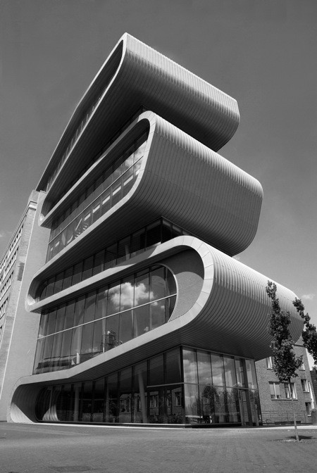 HB: Ook weer mooie krommingen in het nieuwe gebouw van Umicore in Hoboken. Vooral het verschil van richting in de verschillende niveaus spreekt tot de verbeelding.
