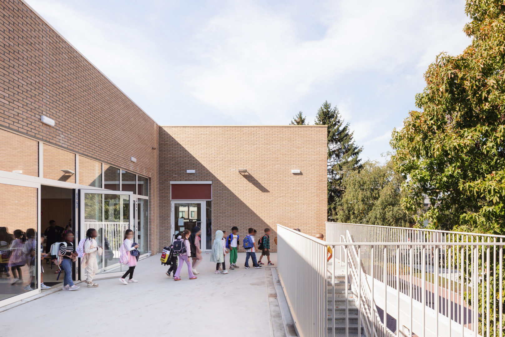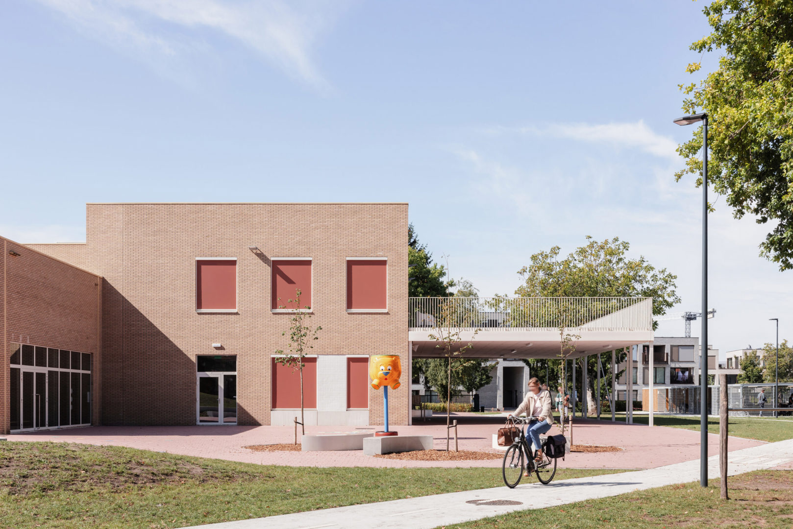 De architectuur zoekt bewust aansluiting bij de schaal van de omgeving en die van het kind. De schakeling van compacte volumes voorkomt een massieve indruk en zorgt voor een leesbare opdeling van het programma. Een zandkleurige gevelsteen geeft het gebouw een warme, rustige uitstraling, terwijl grote glaspartijen op het gelijkvloers het contact tussen binnen en buiten versterken. Zo blijft het spelende leven van de school zichtbaar en voelt de school zich ingebed in haar omgeving.