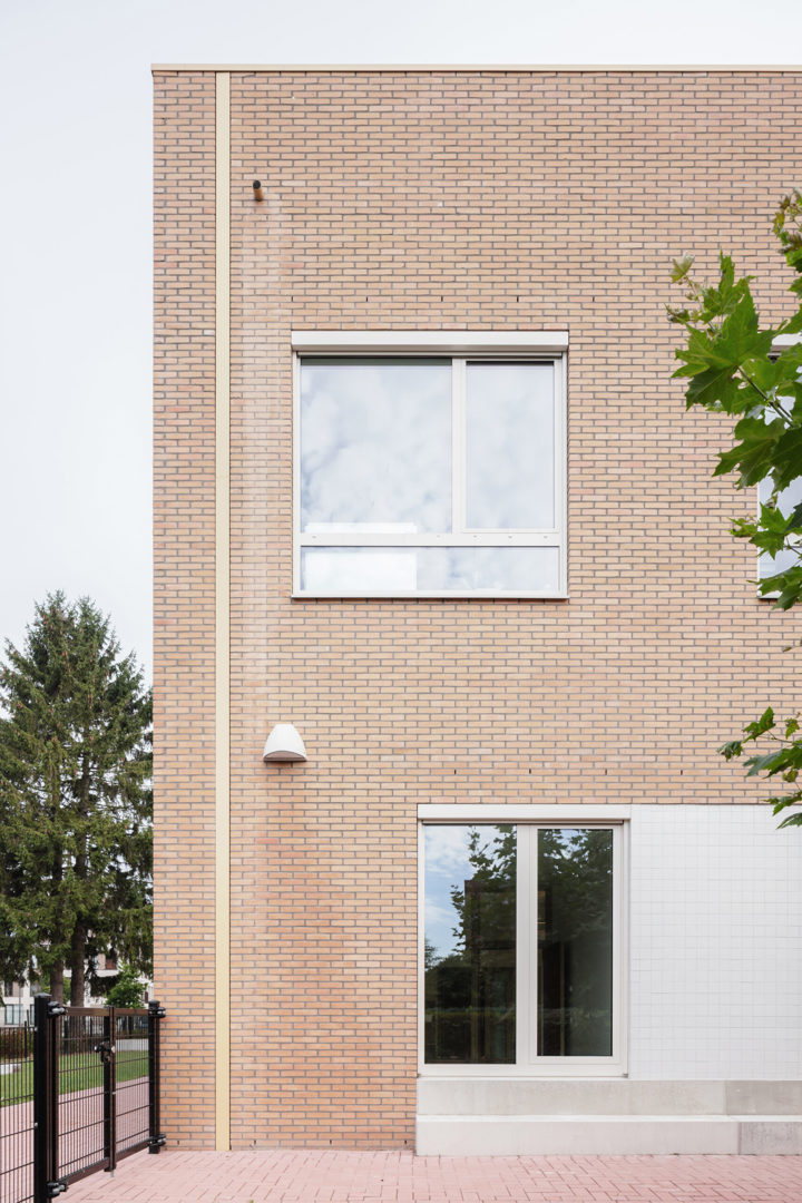 De oude, verspreide schoolgebouwen maakten plaats voor één compact volume van twee bouwlagen, ingeplant aan de rand van het perceel. Die positionering houdt het midden van de site maximaal vrij en levert een ruime, groene speel- en ontmoetingsruimte op. Door die ontwerpkeuze kan de school zich ook naar de buurt toe openen en blijft de site flexibel voor mogelijke toekomstige uitbreidingen of aanvullingen.