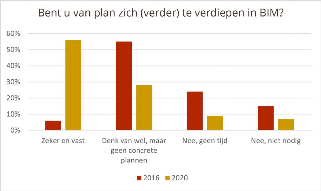 Het dient wel gezegd dat Driesmans een denkfout maakte. Die 40% hoeft immers niet volledig te komen uit de 50% die aangaf nog geen gebruik te maken van BIM. De vraag luidde: ‘Bent u van plan zich (verder) te verdiepen in BIM?’ Wie negatief heeft geantwoord op die vraag, is mogelijks nu al wel gewoon BIM-gebruiker, maar zonder plannen om er nog meer over te leren.
