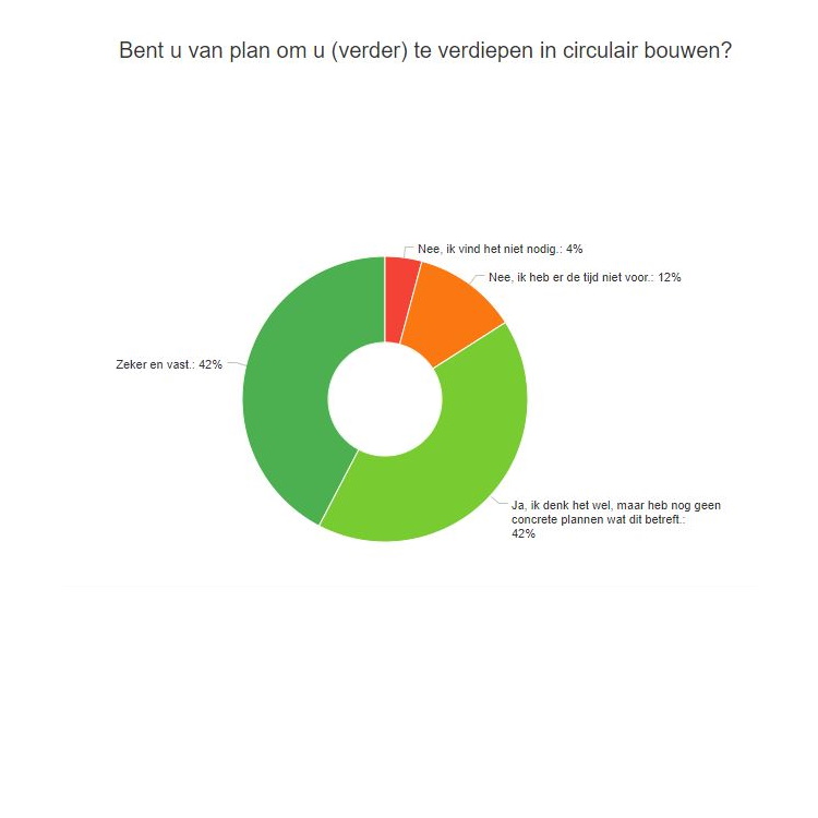 Het merendeel van de architecten is van plan zich (nog verder) te verdiepen in circulair bouwen. 43% wil daar absoluut werk van maken, een bijna even groot percentage is daar ook toe bereid maar heeft nog geen concrete plannen in die richting. Slechts 16% ziet er geen heil in om het circulair bouwen onder de knie te krijgen. 12% bij gebrek aan tijd, 4% omdat hij of zij het niet nodig vindt.