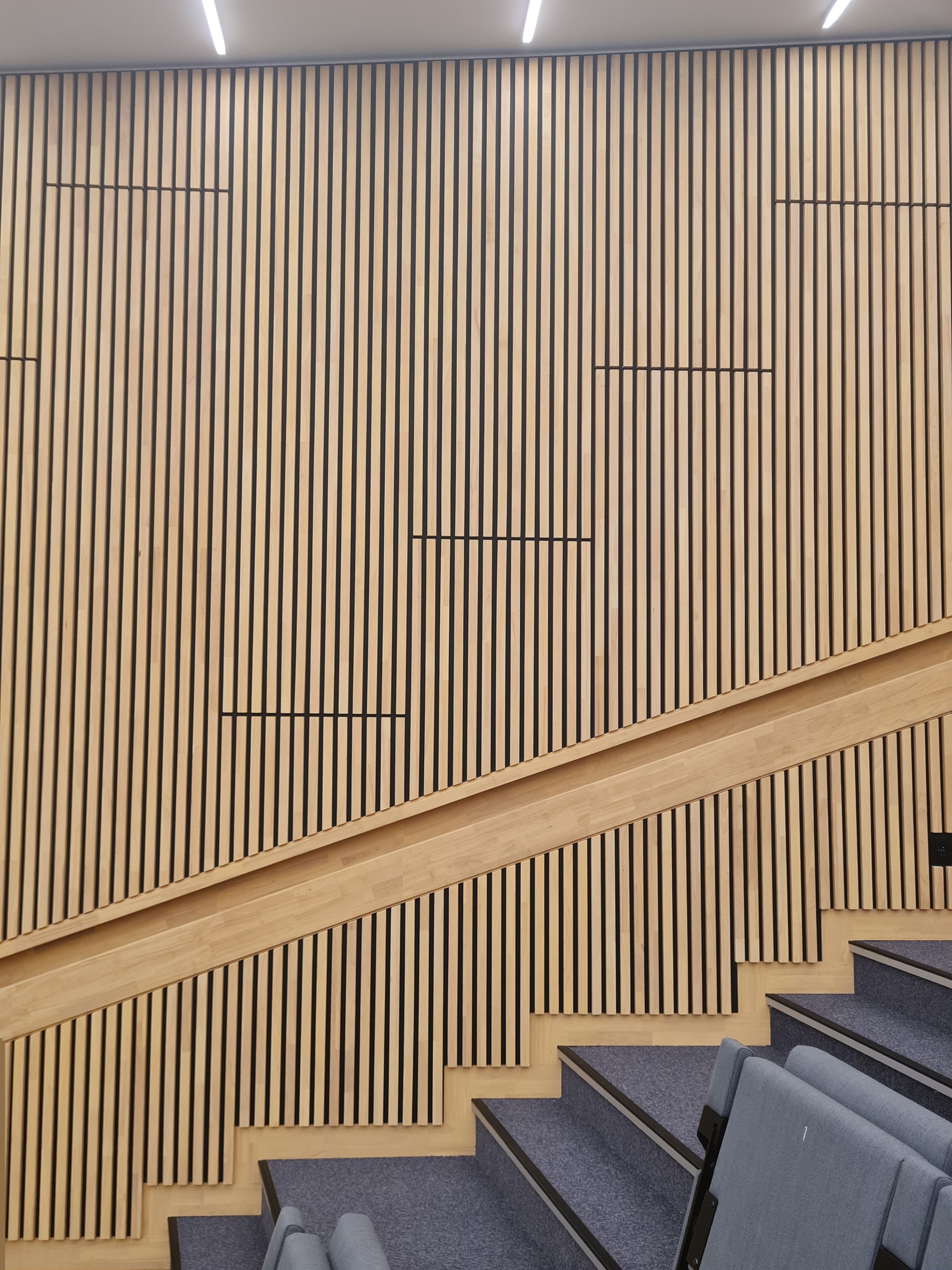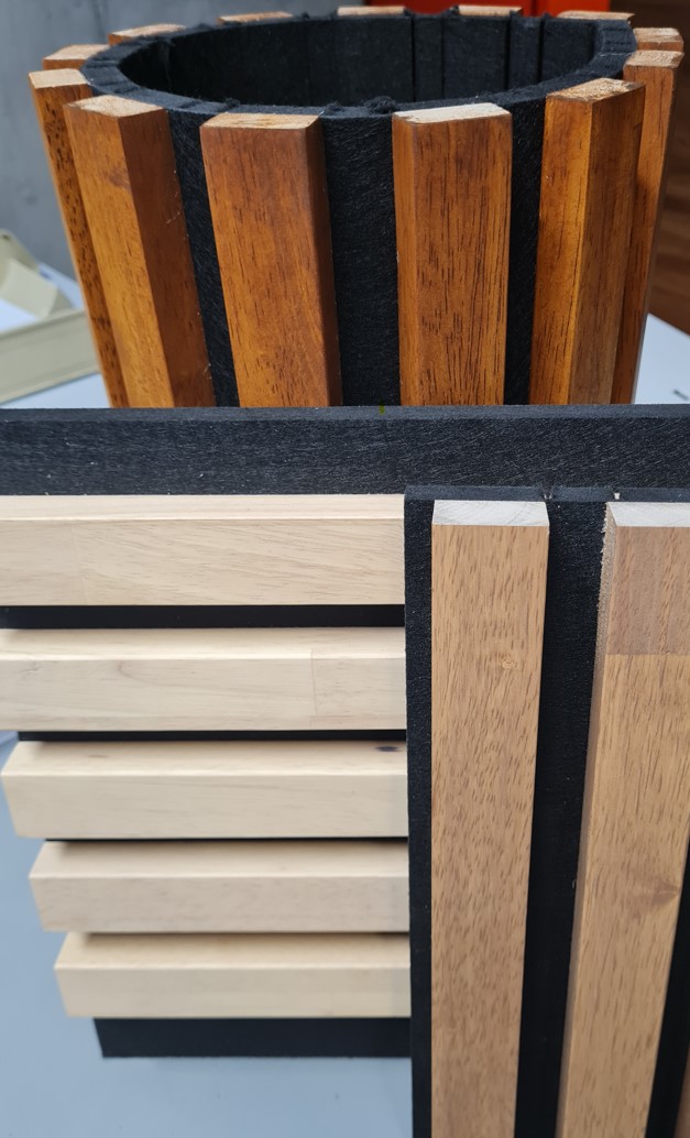 Ls m : Latten massief op PET vilt zwarte plaat: nl Akoestische plaat met massieve latten (Eik, Rubberwood of Vuren) verlijmd op een zwarte 12mm PET plaat.