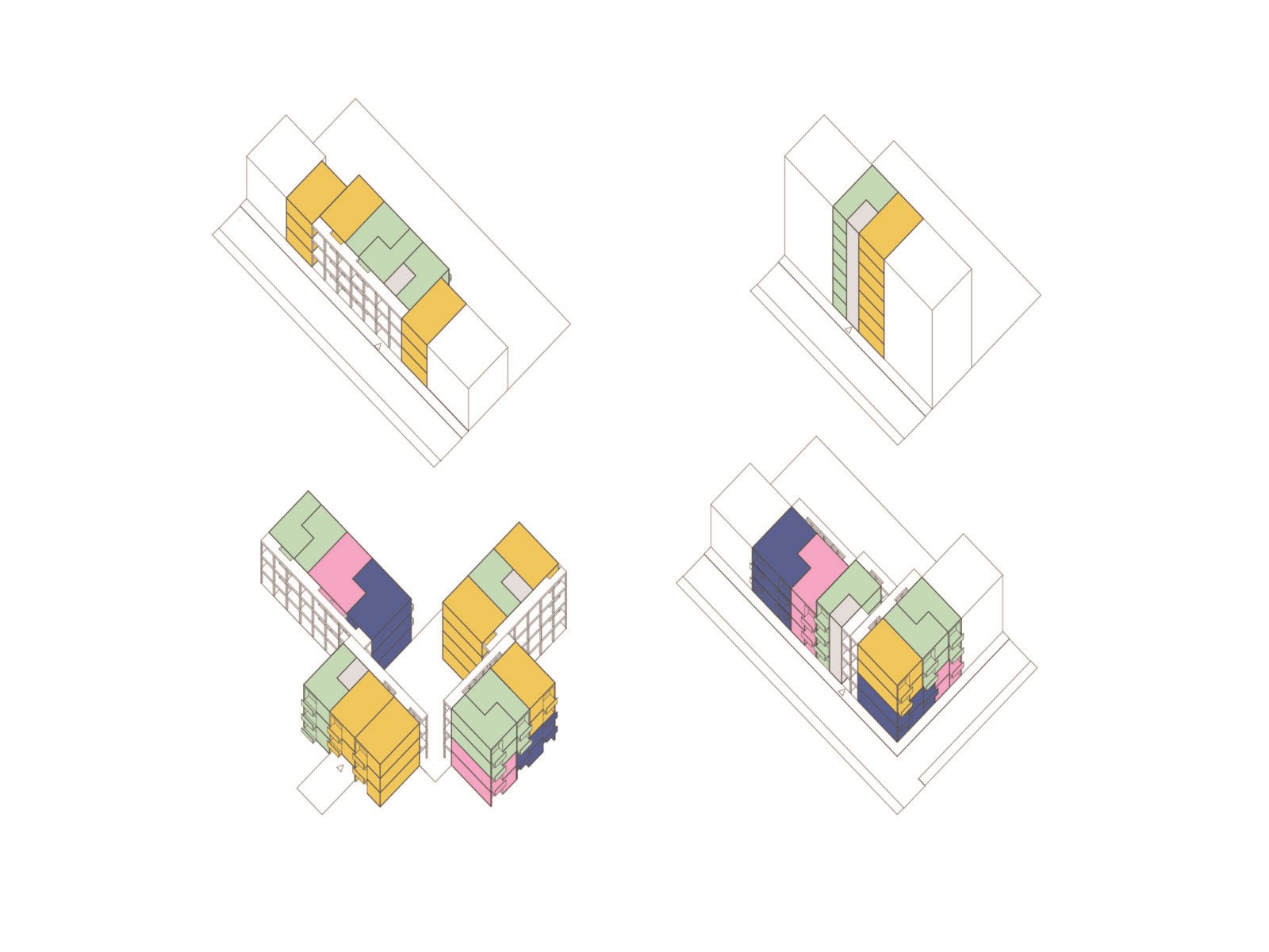 Het ontwerpteam ontwikkelde de vier gevraagde basistypes voor appartementen (1/2, 2/3, 3/4 en 3/5) op basis van acht ontwerpprincipes. Het concept van het basistype 2/3 bestaat erin een doorzonappartement te realiseren van 12m diep en 3 parkeerplaatsen breed. Op die manier kunnen toekomstige appartementen structureel en snel gekoppeld worden aan een ondergrondse parkeergarage. De inpassing van de andere types kan planmatig worden afgeleid uit dit type 2/3. Via L-vormige planopstellingen, kunnen er namelijk extra kamers en badkamers toegevoegd worden.