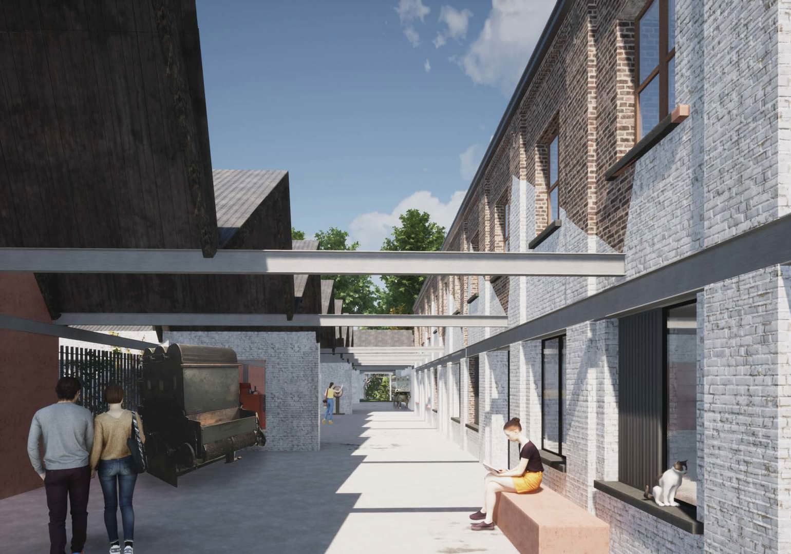 Het karakter van de plek wordt bepaald door de bakstenen volumes die sinds 2009 als bouwkundig erfgoed zijn gecategoriseerd. Binnen de bestaande muren van de fabriek worden dertien lofts en woningen ondergebracht, aangevuld met vijf nieuwbouwwoningen op het terrein. Op de begane grond is ruimte gereserveerd voor ateliers, kantoren of horeca om de sociale interactie op het centrale plein te stimuleren. Zo ontstaat een leeffabriek waarbij de oorspronkelijke morfologie van de gebouwen de indeling van de nieuwe woningen dicteert. De organisatie van deze volumes zorgt voor een natuurlijke overgang tussen de private woonunits en de gedeelde ruimtes.