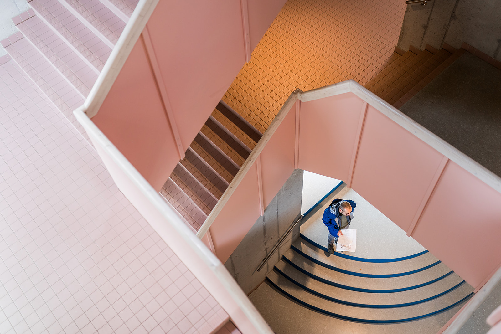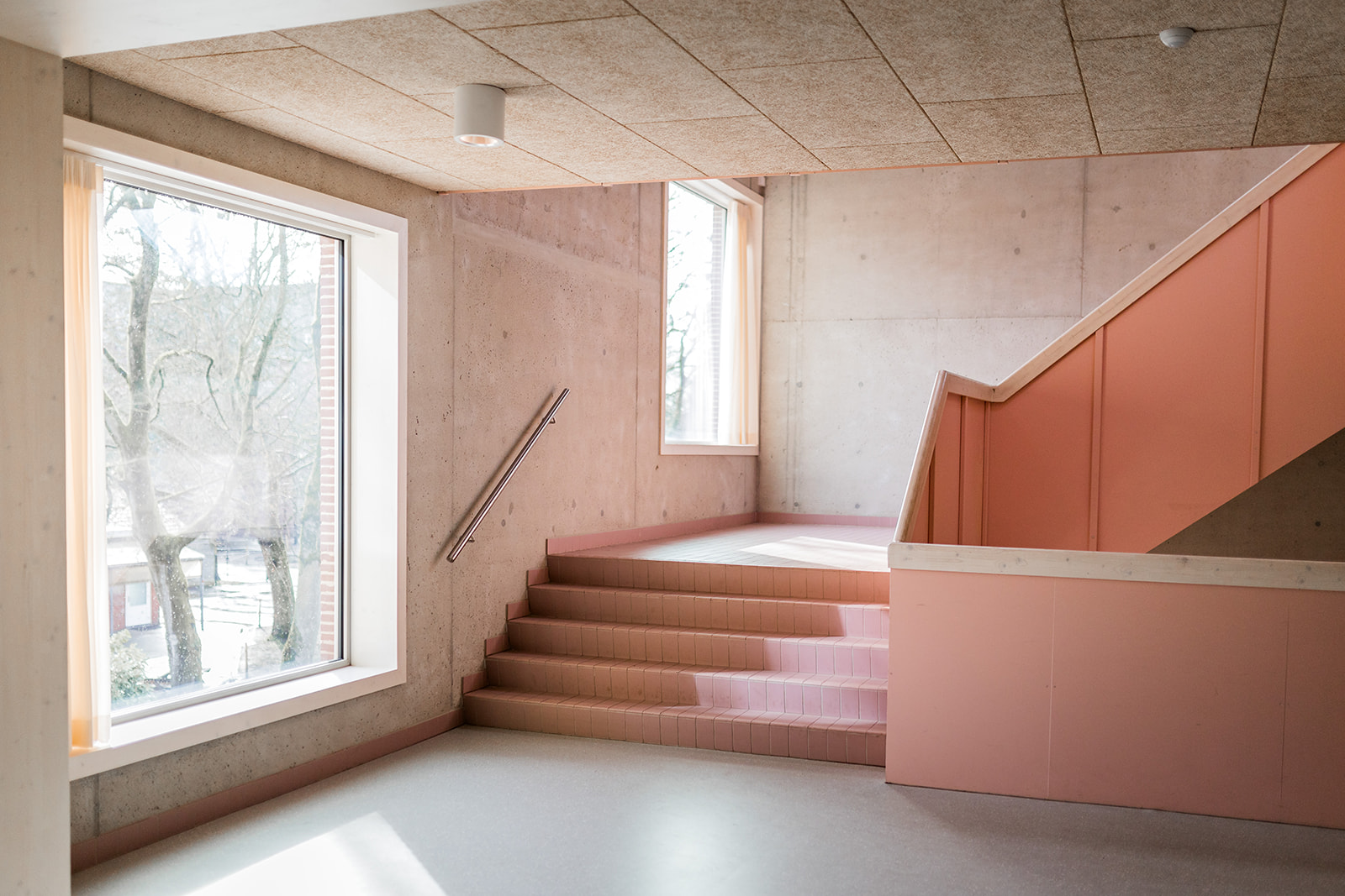 De materialisatie volgt een collagestijl waarbij robuustheid en verfijning elkaar ontmoeten. De muren zijn grotendeels opgebouwd uit betonblokken met een donkere plint en een lichtere bovenbouw. Waar constructief noodzakelijk, is gegoten beton toegepast dat vervolgens is gestraald om beter aan te sluiten bij de blokken. Om een steriele omgeving te vermijden, combineerden de architecten lichte houtsoorten zoals grenen met groene MDF en Portugese gridtegels in de basiskleuren groen, roze en blauw. Gordijnen in groen- en beigetinten zorgen voor een huiselijk accent en dragen bij aan de akoestiek en zonwering. Bovendien zijn de gordijnen aan de zuidkant vervaardigd uit een warmtewerende stof om de temperatuur in het gebouw aangenaam te houden.