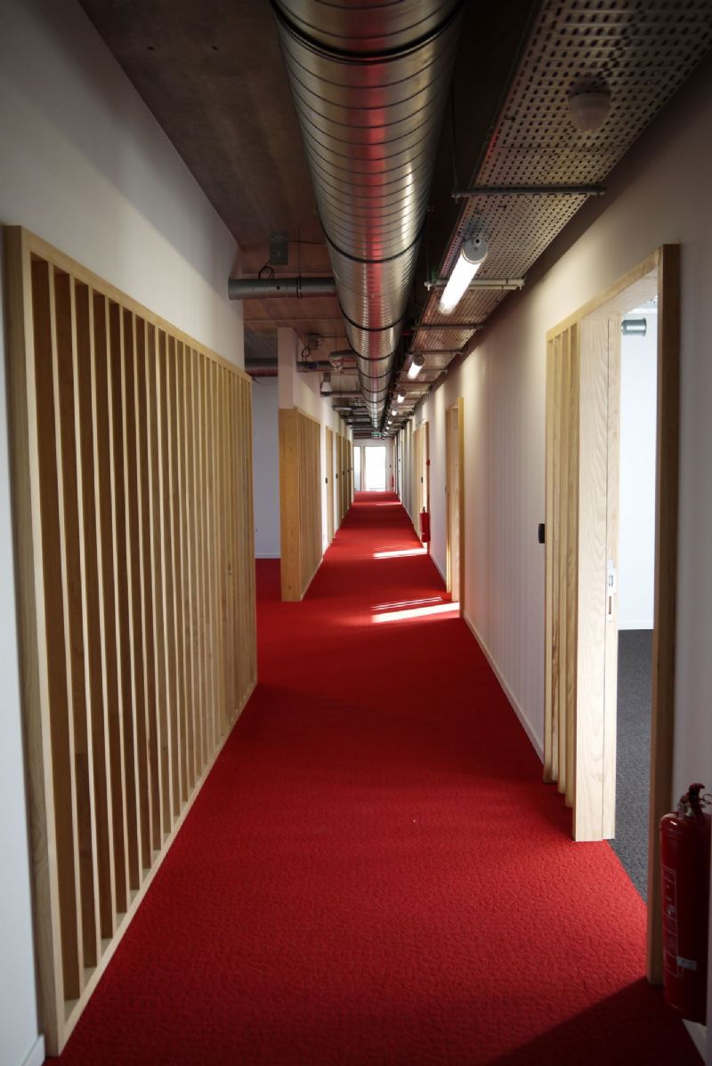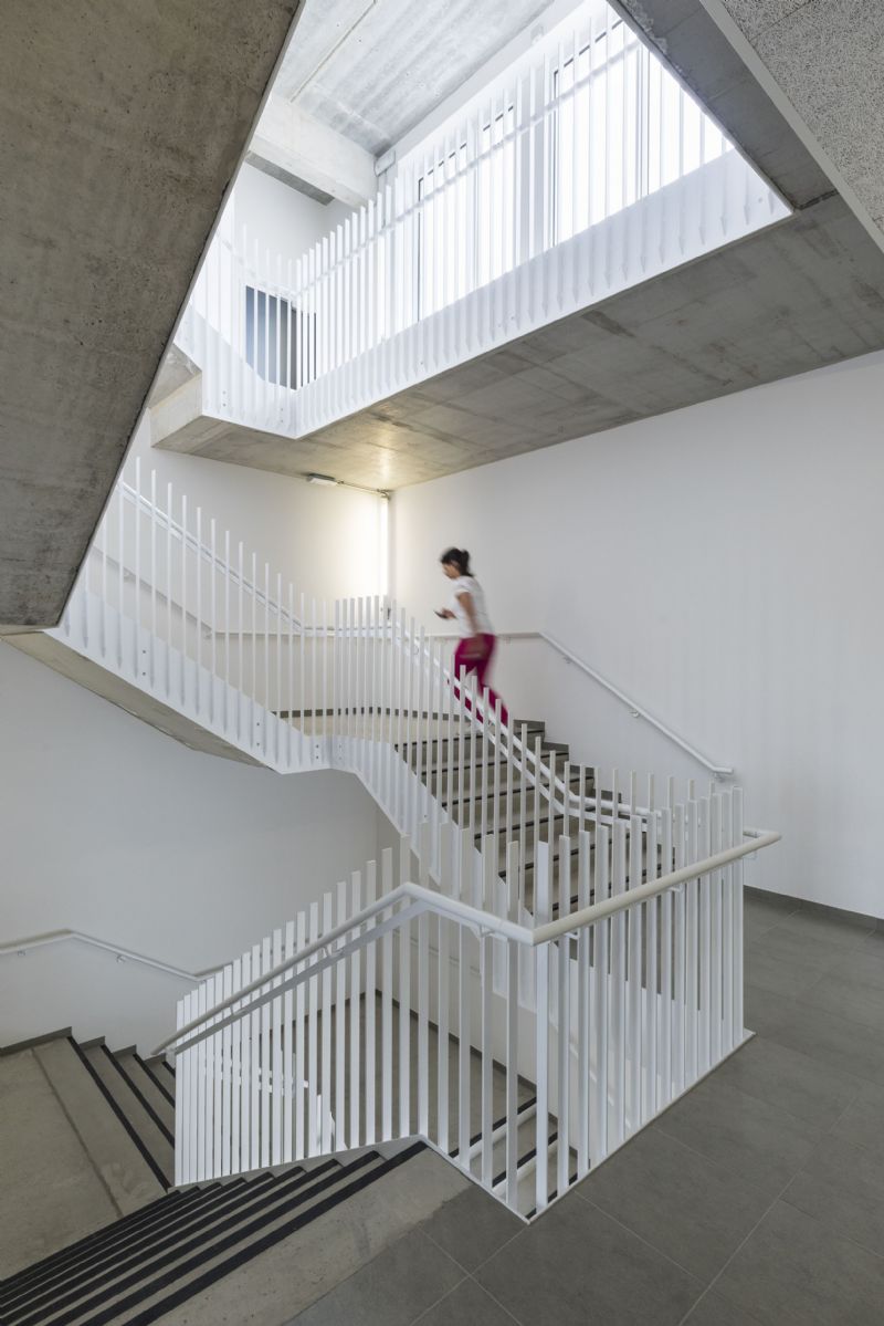 De publieke voorzieningen situeren zich op het gelijkvloers. Daarboven zijn laboruimten voor specifiek onderwijs en een groot compartimenteerbaar auditorium met een capaciteit van 420 personen ingeplant. Op de hogere verdiepingen bevinden zich auditoria, een open leercentrum, klaslokalen en de administratie.