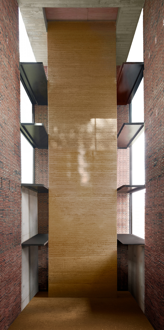 Samen met het bouwteam werd onderzocht hoe de aanwezige klei-leemaarde aangewend kon worden voor het bouwen van een stampleemwand. Aan de fijne leemgrond van de site werd klei toegevoegd als bindmiddel, grof zand tegen krimp en gravel omwille van structurele redenen. Alle toegevoegde grondstoffen werden aangevoerd uit eigen regio. De mengeling van materialen werd ter plaatse ‘gestampt’, wat resulteerde in de 15 meter hoge centrale wand.