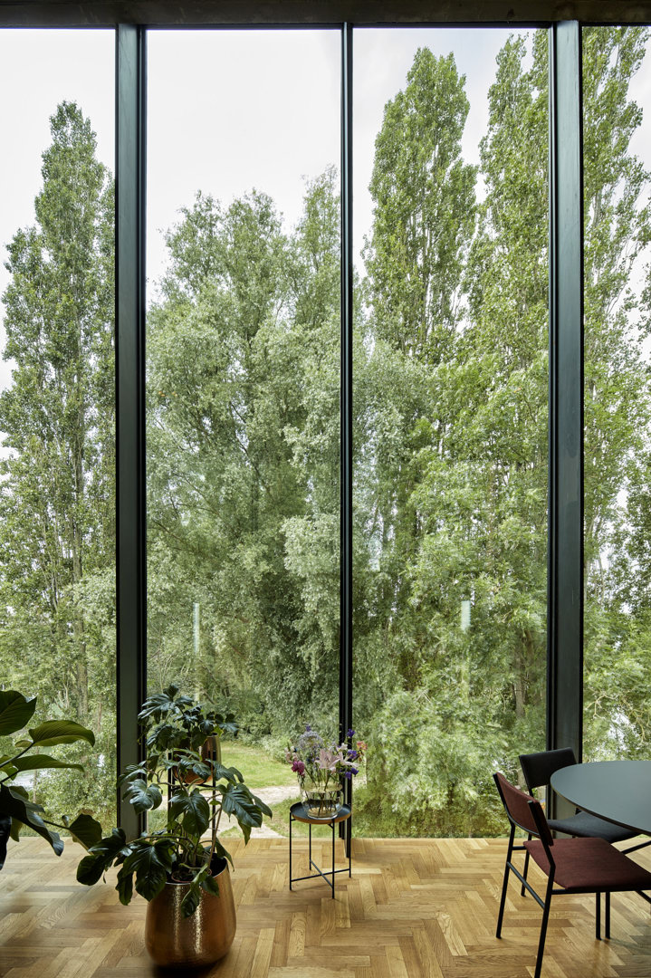De volledig transparante westgevel zorgt op alle vier de bovengrondse niveaus voor een zeer nauwe band met de natuur. Een klassieke indeling met leefruimtes in relatie tot een privétuin op het maaiveld was daardoor niet noodzakelijk. Dat leidde tot de keuze voor een ‘upside-down indeling’: slapen onderaan en leven bovenaan. Later kan nog een dakterras worden gerealiseerd in directe relatie tot de keuken. Die indeling resulteert ook in een optimaal energetisch concept. De koude verspreidt zich vanuit de kelder eerst naar de slaapvertrekken. Door de afwezigheid van deuren profiteren de hogere leefruimtes van de stijgende warme lucht.