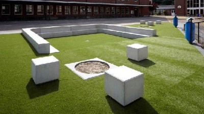 De openluchtklas heeft op zich een vrij eenvoudige vormgeving: het is een vierkant dat aan drie zijden begrensd wordt door een dubbele betonnen boord. Voorts wordt ze omgeven door een driehoek van kunstgras, afgeschermd door een permanent groene haagstructuur en geflankeerd door twee grote lichtdoorlatende bomen. Het groen compenseert de hardheid van de omgeving, terwijl de betonnen wand net voor interactie met die omgeving zorgt. Caers koost bewust voor beton: het is uiteraard erg duurzaam en recycleerbaar, maar bovendien ook vandalismebestendig en snel droog na een eventuele regenbui. Het kunstgras is zacht (waardoor de kinderen zich niet kunnen kwetsen) en makkelijk te onderhouden.