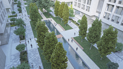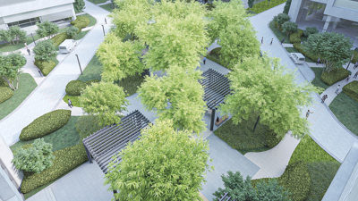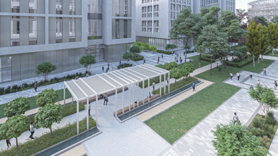 Shuangpu Plot 5 is een veelzijdige locatie voor ontvangst en verblijf die een levendig groen hart biedt aan de omgeving. De centrale tuinzone dient als een opvallend middelpunt en aangename verblijfstuin, waar stijlvolle pergolastructuren de buitenbeleving bevorderen. Het ontwerp is voorzien van een functionele ringweg die optimale bedrijfsactiviteiten ondersteunt. Daarnaast zijn er schaduwplaatsen en comfortabel meubilair opgenomen in het ontwerp om te genieten van de buitenruimte in het subtropische klimaat. Bovendien wordt het landschap verrijkt door een dakconstructie boven de onderliggende parkeerkelder, waardoor er een harmonieuze samensmelting ontstaat tussen groen en functionaliteit.