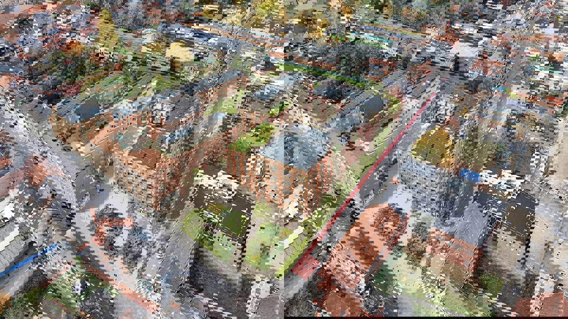 De verbinding met het stedelijk weefsel krijgt vorm door een opeenvolging van pleinen, hoven en autovrije passages die dwars door het blok snijden. Deze versterken de bestaande informele looproutes en maken de site volledig doorwaadbaar. Op een strategische hoek aan de rand van de site markeert een nieuw publiek plein de overgang naar het commerciƫle centrum, waardoor de buurt een logisch verlengstuk wordt van het handelshart van Temse. De publieke ruimte fungeert zo als een gedeelde ontmoetingsplek voor zowel de nieuwe bewoners als de rest van de gemeente.