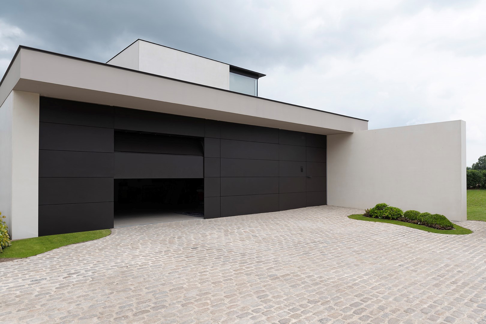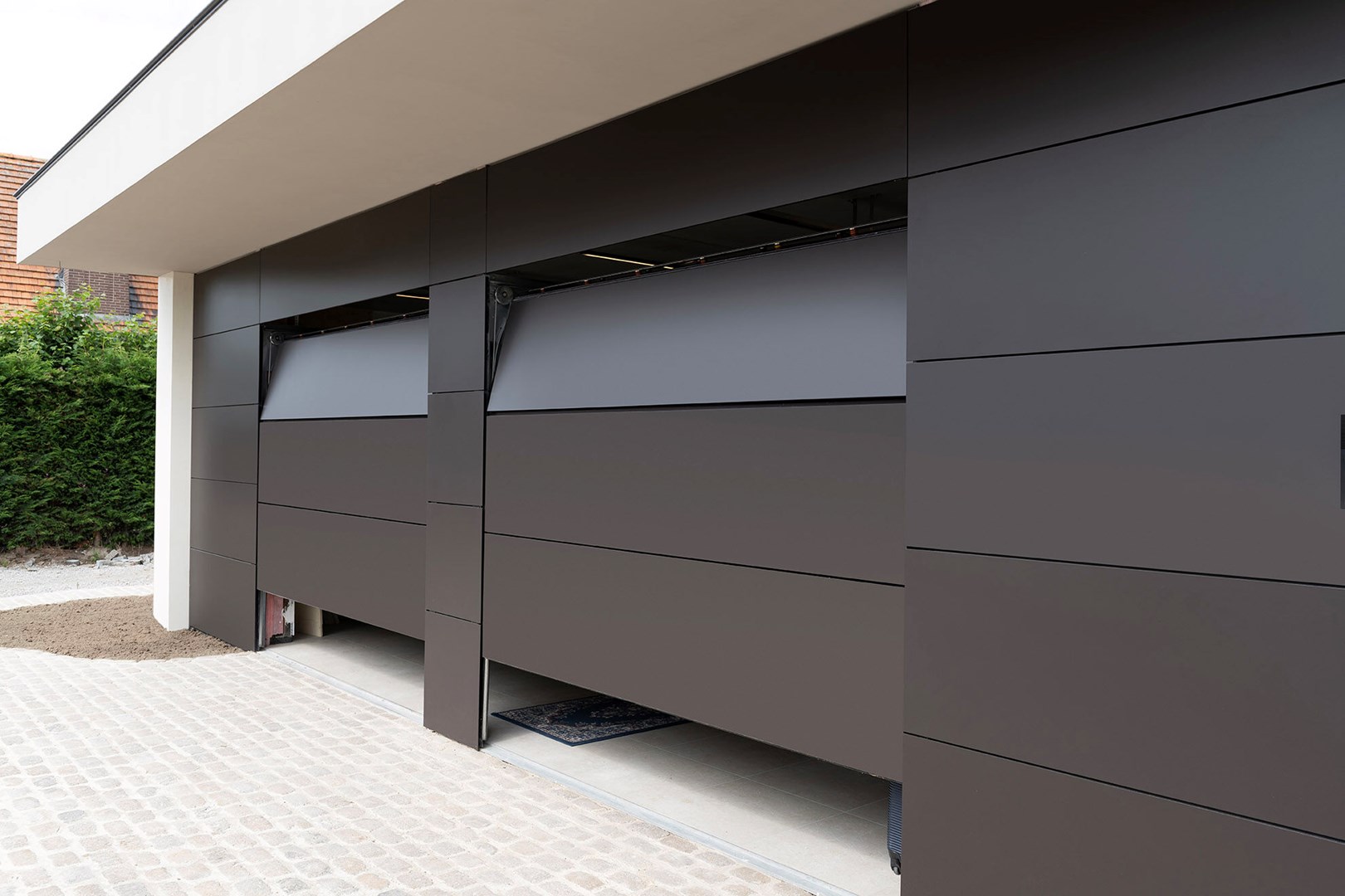 Bovendien kunnen buitendeuren en garagepoorten perfect worden bekleed met hetzelfde materiaal als gevels, waardoor ze opgaan in een strakke en doorlopende gevel. Hierdoor zijn deuren en garagepoorten vrijwel onzichtbaar geïntegreerd in een minimalistische bekleding, die enkel wordt onderbroken door een subtiele inliggende schaduwvoeg, wat bijdraagt aan een sfeervolle en harmonieuze uitstraling.