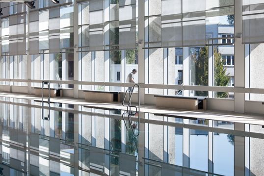 Bij de renovatie van het Olympisch zwembad Namèche Louis in Brussel, heeft het architectenbureau Altiplan het akoestisch comfort van zowel zwemmers als begeleiders in de zwembadhal geoptimaliseerd door akoestische innoverende materialen in te zetten ter hoogte van de raampartijen en muurvlakken die zich buiten stootbereik bevinden. Sonogamma leverde de akoestische bekleding.