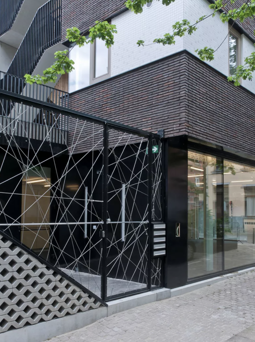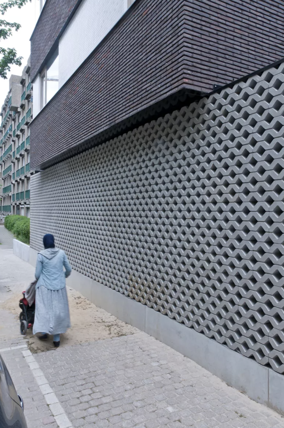 Een massieve sokkel geeft een deeltje van het perceel terug aan de buurtbewoners. Een volledig beglaasd verenigingslokaal lonkt uitnodigend op de hoek, ter bevordering van de sociale verwevenheid met een zekere sociale controle als surplus. Om de hoek zitten technische lokalen voor containers en tellers verscholen achter grasdallen. Massief beton zou hier niet de nodige ventilatie bieden. De grasdallen dienen als drager voor een project waar kinderen elk hun eigen kleurtje kunnen geven aan een gepixeld patroon.