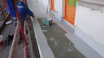 Na een correcte voorbereiding van de ondergrond waarbij een druksterkte van 25 N/mm² en een cohesieve treksterkte van gemiddeld min. 1,5 N/mm² wordt behaald, kan het vloeibare waterdichtingssysteem Sika Balcony Premium System toegepast worden. Hierbij wordt het volledige horizontale oppervlak met de opkanten en balkonneuzen ingepakt zodat het geheel beschermd is.