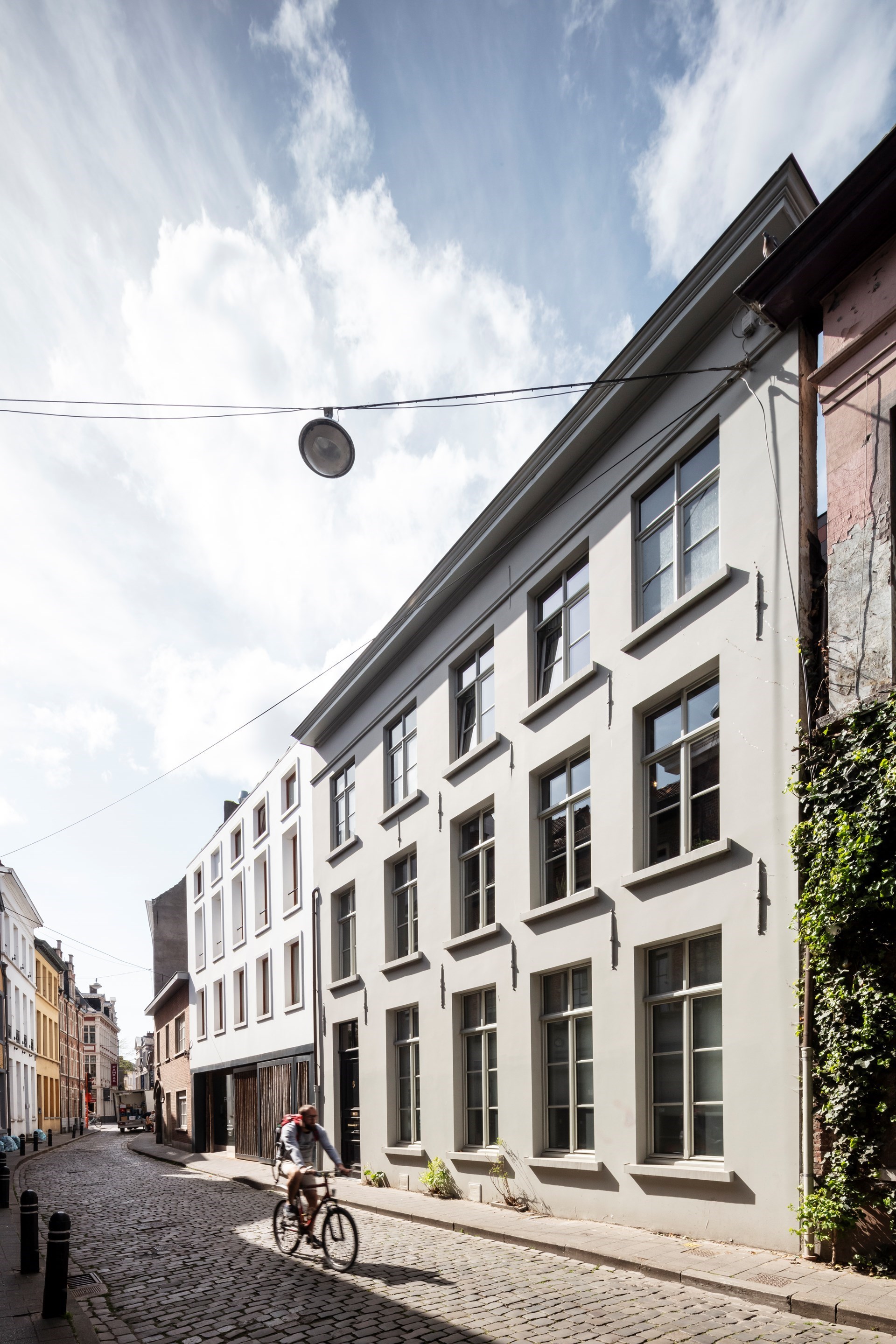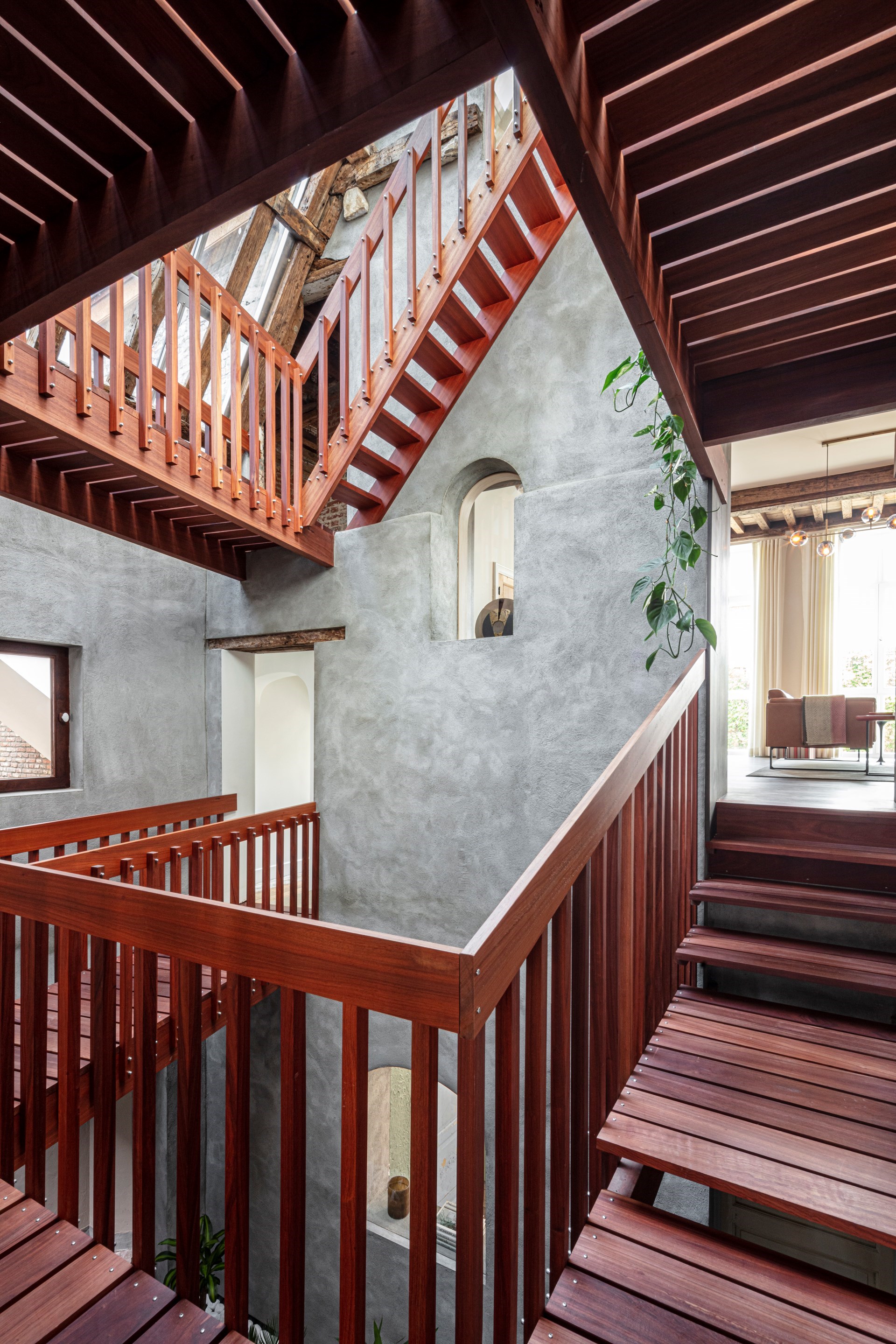 Het immense pand, dat bestaat uit een voorhuis en een achterhuis, telt vooraan vier bouwlagen, en achteraan drie. Door de jaren heen was de tussenruimte tussen de panden ook volgebouwd, op een knutselige manier. De schacht tussen de beide panden diende om goederen naar de bovenverdiepingen te takelen. Die schacht tussen de twee huizen heeft atelier vens vanbelle helemaal opnieuw open gemaakt. De massieve buitenmuren van de twee woningen werden met een cementlaag bezet, zoals je een tuinmuur zou afwerken. Om de verbinding te maken tussen alle niveaus in de twee panden, hebben de ontwerpers in de schacht een complex met houten trappen uitgewerkt. Die maken circulatie mogelijk tussen de verdiepingen in beide delen.