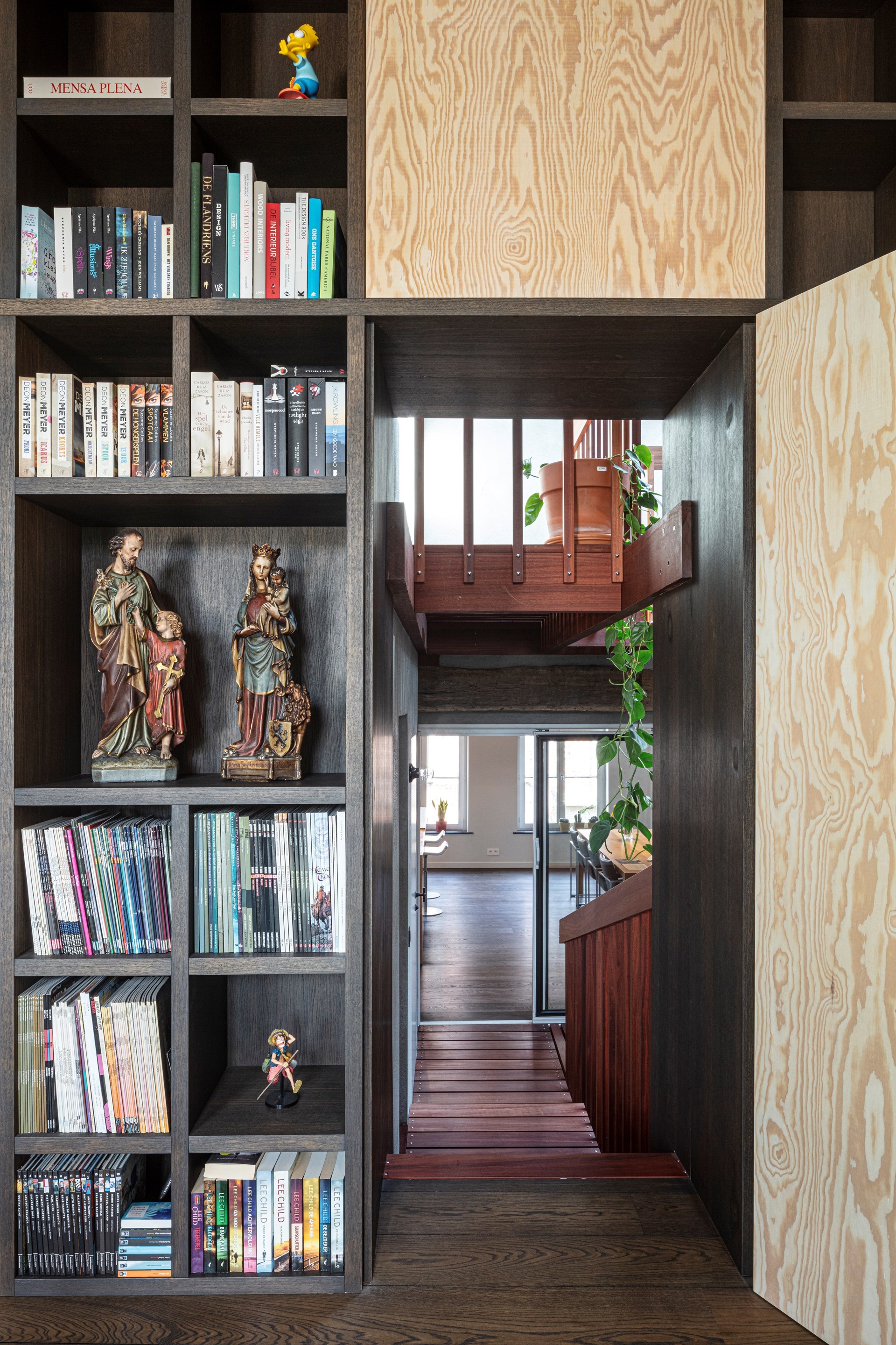 “Het effect van dat trappencomplex, pal tussen de historische panden, is enorm. Zeker nu doorheen het originele dakgebinte, dat overkapt werd met serreglas, licht tot diep in de woning komt. Als je beneden staat, lijkt dat speelse trappenhuis in padoek wel een 3D-versie van een Escher-tekening. Van bovenaf is het eerder een spannend loopbruggenparcours in een avonturenpark. Kwaliteitsvolle, architectuur met een hoog Peter Pan-gehalte dus”, aldus de ontwerpers.