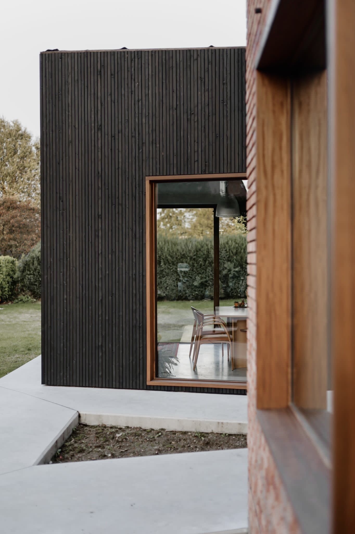 De renovatie en uitbreiding van een halfopen woning voor een jong koppel bood de kans om een atypisch maar omarmend volume toe te voegen aan de bestaande woning. Door de bestaande hoogte van de scheidingsmuur kon er voor een gabarit van het nieuw volume worden gekozen dat schuin oploopt naar een L-vormig volume met asymmetrisch zadeldak. De L-vorm zorgt ervoor dat de toegang tot de woning zich kan situeren tussen het nieuwe volume en de bestaande woning: als het ware een open en rustige buitenruimte die de bezoeker centraal in de woning leidt. Vanuit de eetkamer in het nieuwe volume hebben de bewoners zicht op de tuin, voortuin en de inkomzone van de woning. Door de planvorm krijgt deze ruimte ook daglicht vanuit verschillende oriëntaties.