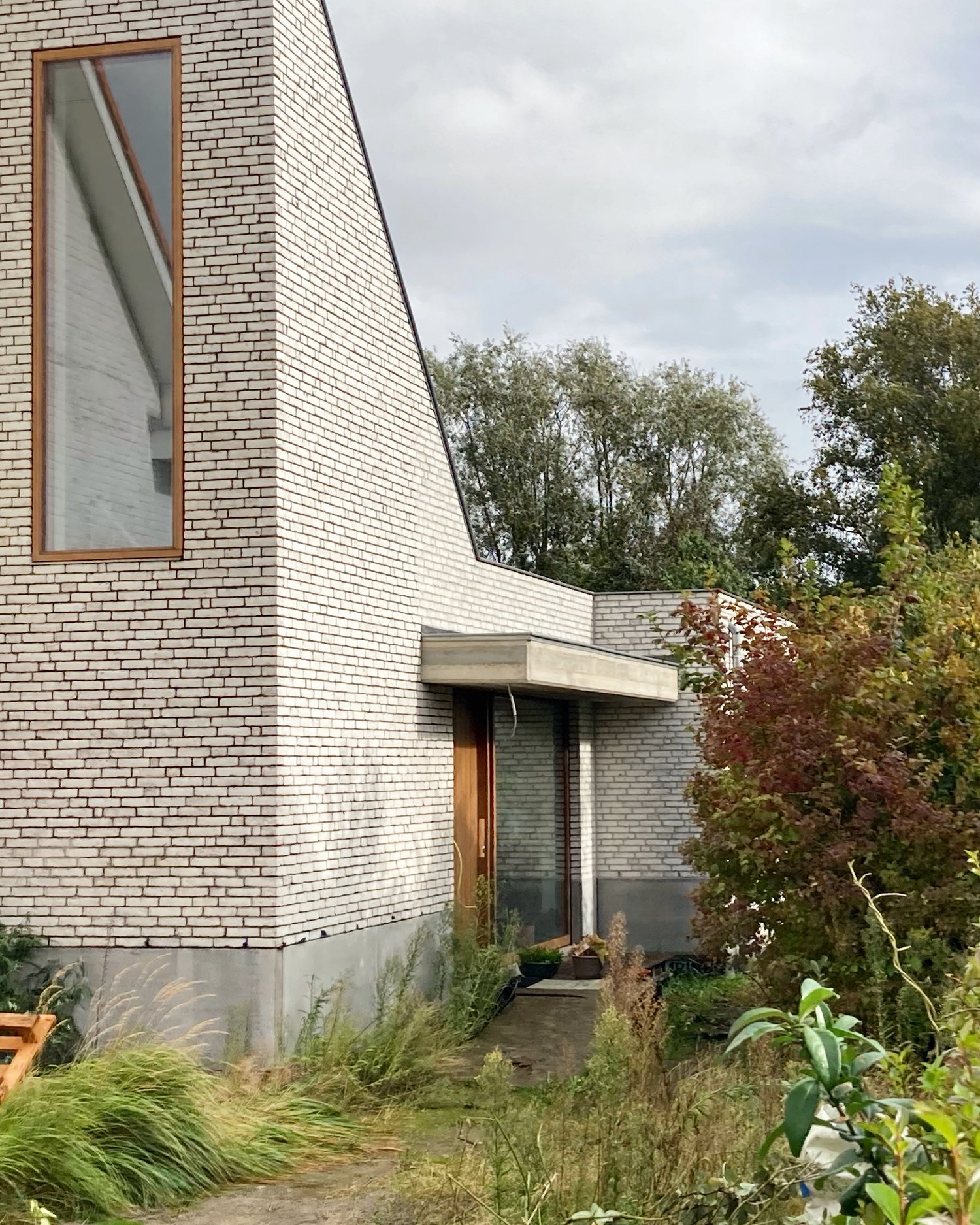 Een halfopen woning uit de jaren '60 vroeg om een grondige renovatie met uitbreiding. De bestaande koterijen werden afgebroken op het gelijkvloers en een nieuwbouw werd toegevoegd. Deze uitbreiding biedt de mogelijkheid voor de opdrachtgevers om hun slaapkamer op het gelijkvloers te voorzien. Een ruwe structuur in beton werd toegevoegd en takt aan op een centrale patio in het nieuw volume. De keuken, gelegen langs de tuinzijde, heeft zijn eigen vormentaal met zadeldak op kleine schaal en knipoog naar wat ooit was. Alle woonruimtes situeren zich rond de patio. Het betreden van de woning gebeurt onder een betonnen luifel die de bezoeker reeds een glimp biedt van de gekozen materialen in de woning. De witte gevelsteen rust op een betonnen plint die de contouren van het nieuwe volume volgt. De houten ramen in afzeil zorgen voor een warme uitstraling, zowel binnen als buiten de woning.