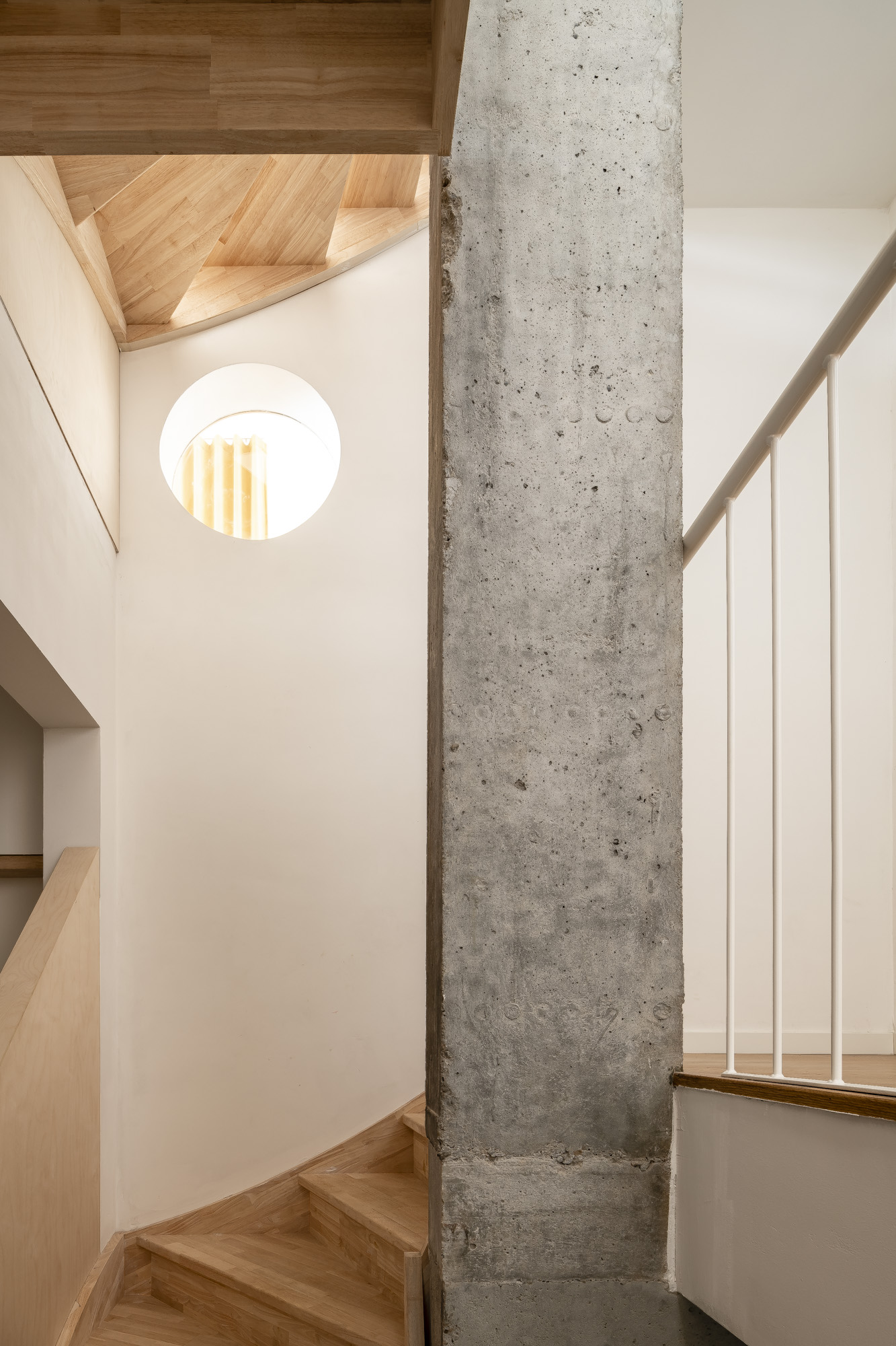 Het perceel werd omgevormd tot twee driegevelwoningen waarvan de achtergevel grotendeels in de grond zit (vooraan drie niveaus en achteraan één niveau). Toch werd er een enorme ruimtelijke kwaliteit in de woningen gerealiseerd. Het hoogteverschil loste de architect op door grotendeels te werken met splitlevels. Halve verdiepingen vloeien in elkaar over dankzij een open trappenhal. Hierdoor voelen de woningen minder verticaal aan en lijkt het één open ruimte te zijn. De openheid werd regelmatig afgewisseld met intiemere ruimtes.