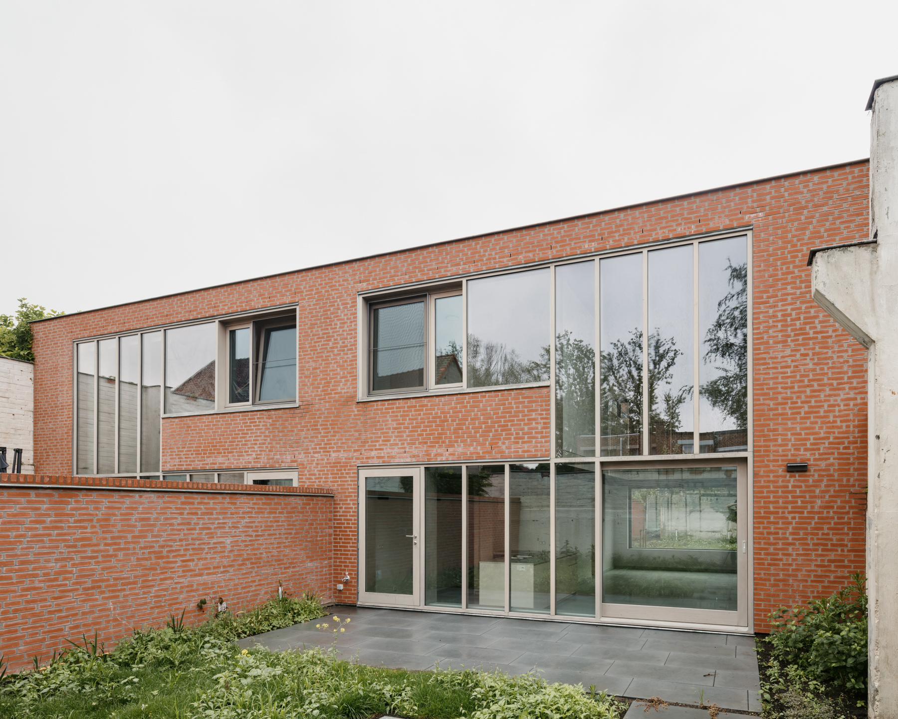 De tuin schakelt verschillende private, semi-private en publieke groenzones aaneen. Het gemeenschappelijke stuk brengt de voortuin van twee woningen samen en wordt gebakend door het oude spant van de loods. De woning vormt de doorsteek van de voortuin naar de private achtertuin. Een centrale vide in de woning geeft het huis privacy, maar ook voldoende natuurlijk licht.