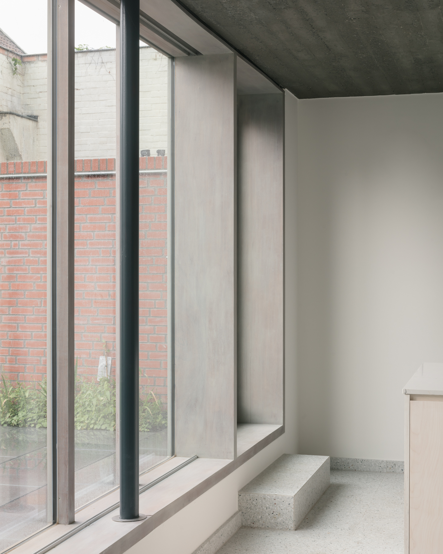 De intensieve ontharding van de buitenruimtes zorgt voor groen en zuurstof. In plaats van te bouwen op een perceel, kiest de architect ervoor om de grauwe binnenruimte om te vormen tot een kleine plek in de stad waar lucht en licht centraal staat.