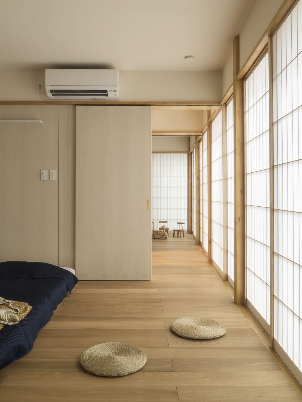 Om op deze beperkte ruimte een maximaal en hedendaags wooncomfort te garanderen werd een licht trapezoïde grondplan ontwikkeld. Het “opbergen” van de ontsluiting langs één zijde en het tegelijkertijd indirect toetreden van licht ook via deze blijkbaar afgescheiden ruimtes via shoji’s vergroot zo de ruimtelijke perceptie. Ook de stompe hoek aan de zuidwestelijke kant leidt tot een gevoelsmatige opening naar de open ruimte buiten het perceel tot het Sanjo Hachiman Shrine, een culturele erfgoedsite waar jaarlijks ceremonies plaatsvinden.