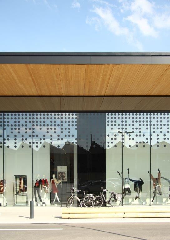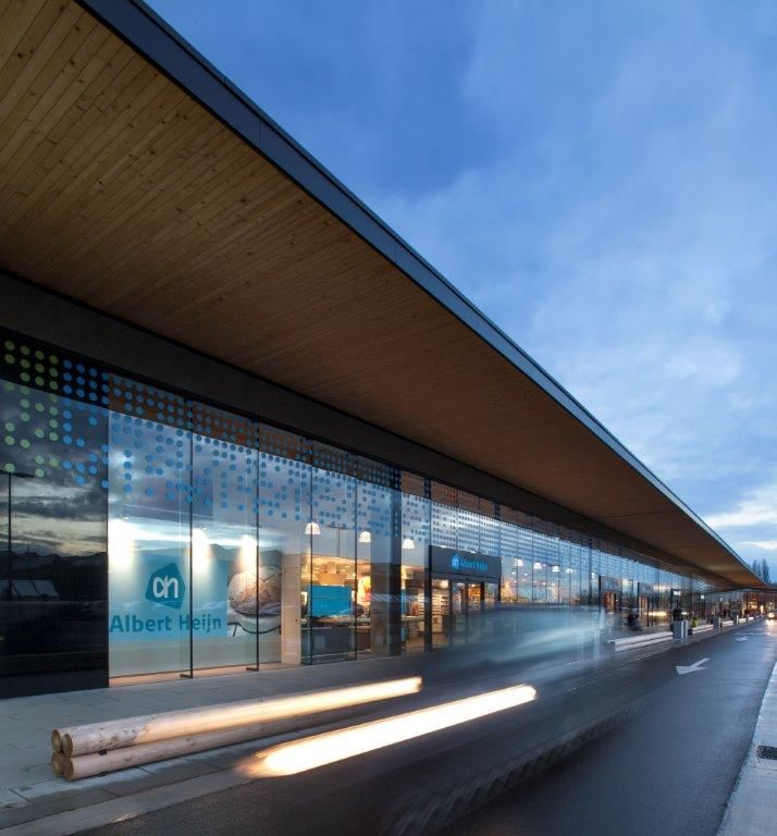 Het nieuwe retailpark kreeg de toepasselijke naam be-MINE Boulevard, een vlag die de lading volledig dekt. De winkels zijn gevestigd in een langwerpig volume met een knappe houten luifel waarlangs het heerlijk flaneren is. Het 375 meter lange geheel bevat netto maar liefst 15.000 m² commerciële ruimte. Het is ontworpen door Jaspers-Eyers UAU Collectiv, dat zijn stempel drukte op quasi alle ontwerpmatige keuzes: “Het volume dient zich aan als een vrij strakke betonconstructie die modulair is opgebouwd volgens een grid van 12 meter”, aldus projectarchitect Frederik Vaes van UAU Collectiv. “Dit maakt dat de winkelconfiguraties indien nodig relatief eenvoudig aan te passen zijn. Vermits de inrichting quasi volledig in handen was van de winkels zelf, is de enige rode draad in het interieur het houten plafond van de luifel, dat in de eerste zeven meter na de inkom overal zichtbaar moest blijven. De luifelconstructie kraagt aan de buitenzijde vijf meter uit en is opgebouwd uit speciale, zwevende welfsels van de Oostenrijkse firma Kielsteg – een primeur voor België. De voorgevel bestaat quasi integraal uit gestileerde beglazing die je bijvoorbeeld ook vaak in showrooms van garages terugvindt. De zwarte sandwichpanelen van de zij- en achterwanden vormen een subtiele verwijzing naar de prominente rol die steenkool destijds speelde op de site. Een andere bijzonderheid is dat we eveneens inspraak hadden in de merkgerelateerde advertising van de winkels, die uniform is en perfect aansluit bij het concept dat we voor ogen hadden. De doorlopende ledstrip bovenaan de beglaasde voorgevel is de kers op de taart en geeft het geheel bij duisternis een iconisch gehalte.”