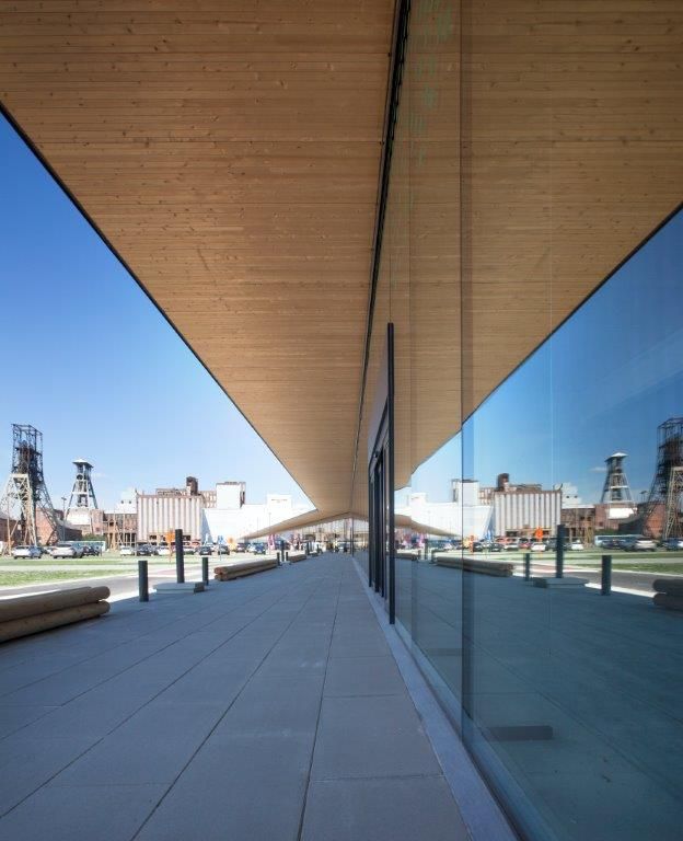 Niet enkel het gebouw an sich, maar ook de bijzondere locatie maakt be-MINE Boulevard uniek. Het industrieel erfgoed vormde de vertrekbasis voor het ontwerp, geeft Vaes aan: “Het bijzondere aan het retailpark is dat het niet zomaar langs een steenweg gelegen is, maar dat het zich middenin het industriële litteken van een oude mijnsite bevindt. We hebben dan ook heel wat aandacht besteed aan landschappelijke integratie. De luifel in onbehandeld hout zorgt voor een prima synergie met de omgeving. Om het zicht op de achterliggende terril niet te verstoren, hebben we ervoor gezorgd dat er op het dak en in de achtergevel geen sprake is van doorvoeren, installaties of andere visuele obstakels. Een ander aandachtspunt was het uitzicht vanaf de terril, die met zijn groene uiterlijk naadloos aansluit op het retailpark. Het complex is immers uitgerust met een imposant groendak van maar liefst 18.000 m² – het grootste van België – en grenst aan een groene parking met grastegels (capaciteit: 750 plaatsen). Tot slot stonden we ook in voor de inrichting van de buitenruimte, die we extra kleur hebben gegeven via speciaal samengestelde houten banken en een compositie van zes meter hoge funderingspalen waarop klimplanten groeien.”