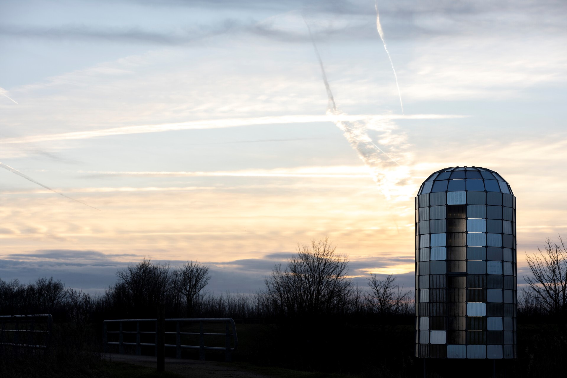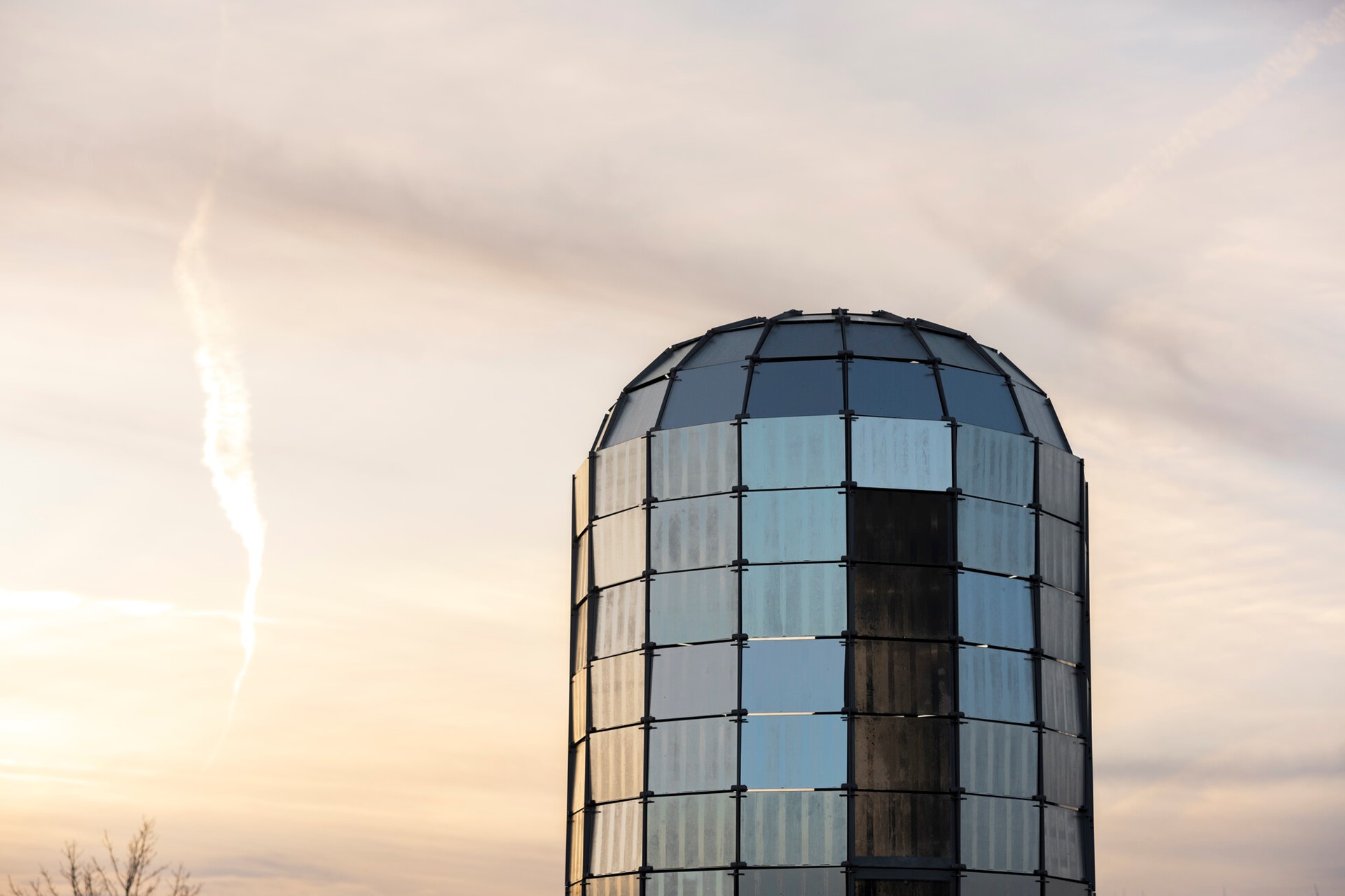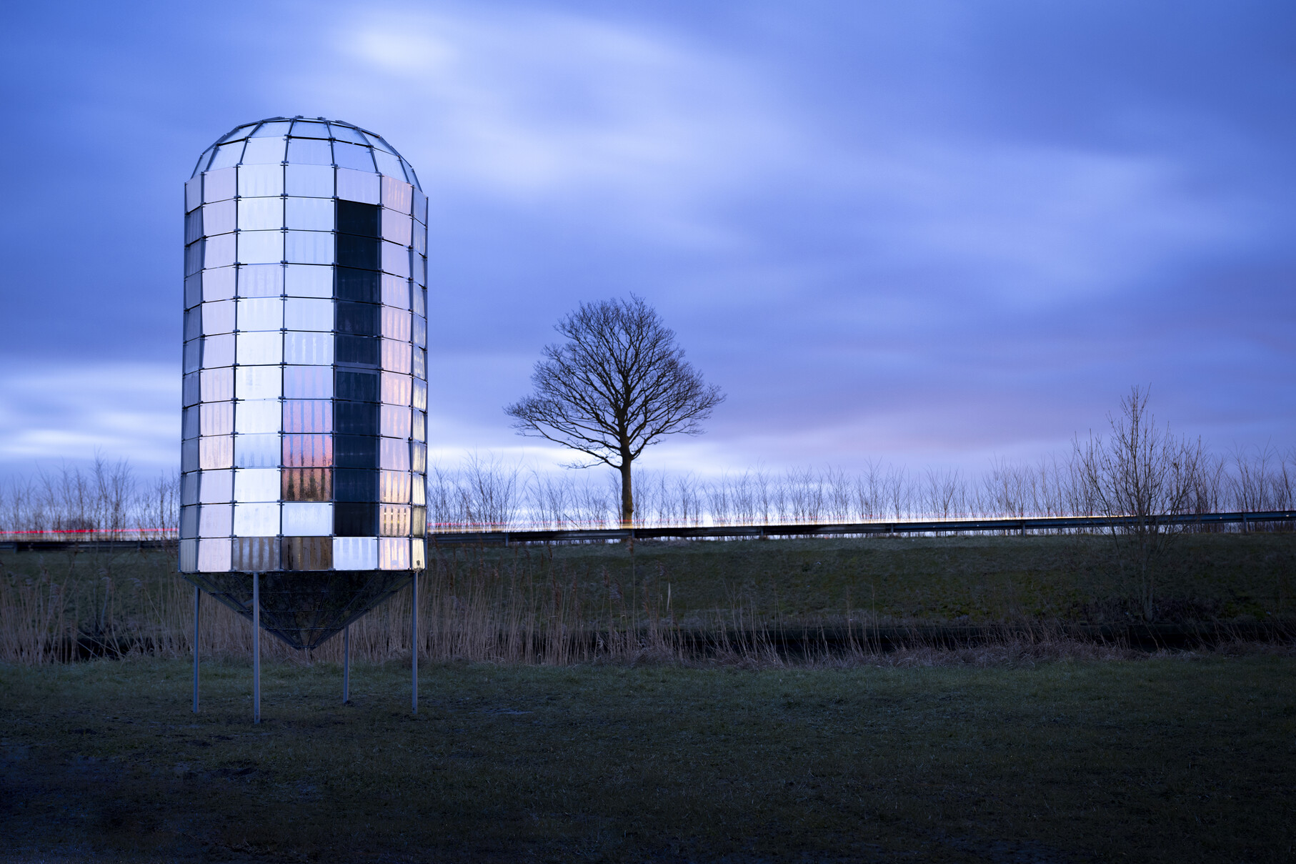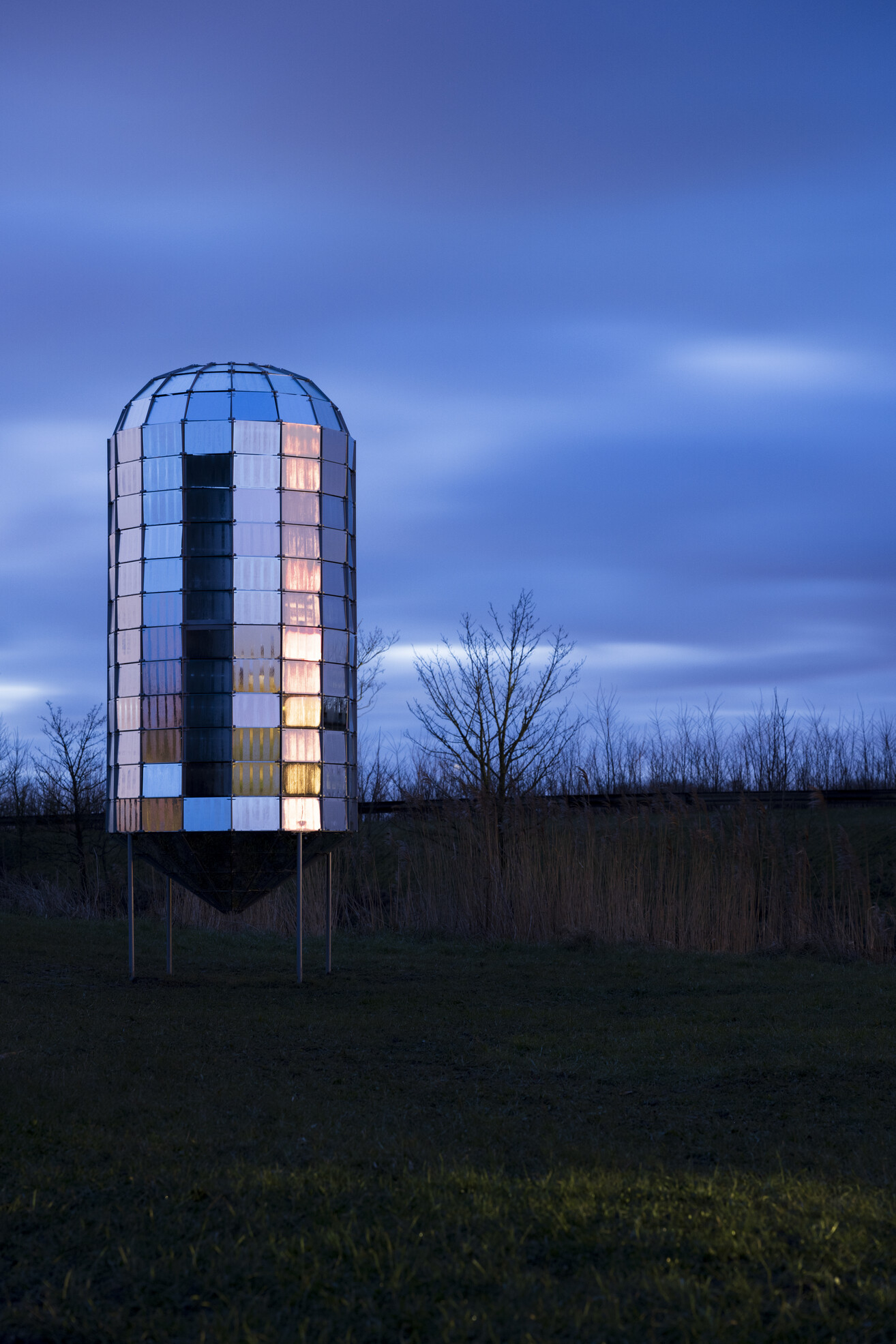 Door het spiegelende oppervlak van de vierkante, glazen vlakjes vervormt en verwart het werk ons tegelijk. Als in een caleidoscoop zie je verschillende beelden naargelang je eigen positie. We worden geprikkeld om stil te staan bij wat vooruitgang en toekomst betekenen. In de ogen van de ontwerper Le Corbusier was de silo een ultiem symbool van vooruitgang en een essentiële vorm van architectuur. Een capsule is ook op te vatten als een tijdcapsule: we sturen die naar de ruimte of graven ze in voor toekomstige generaties.
