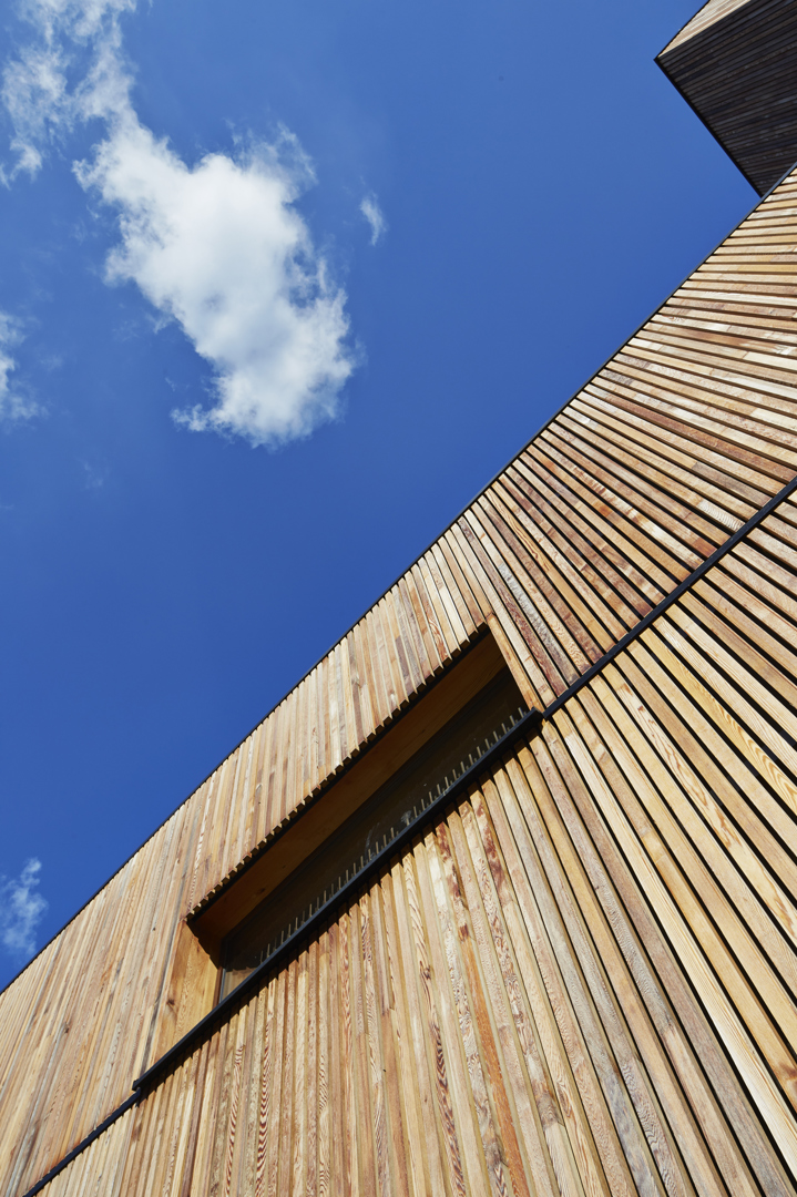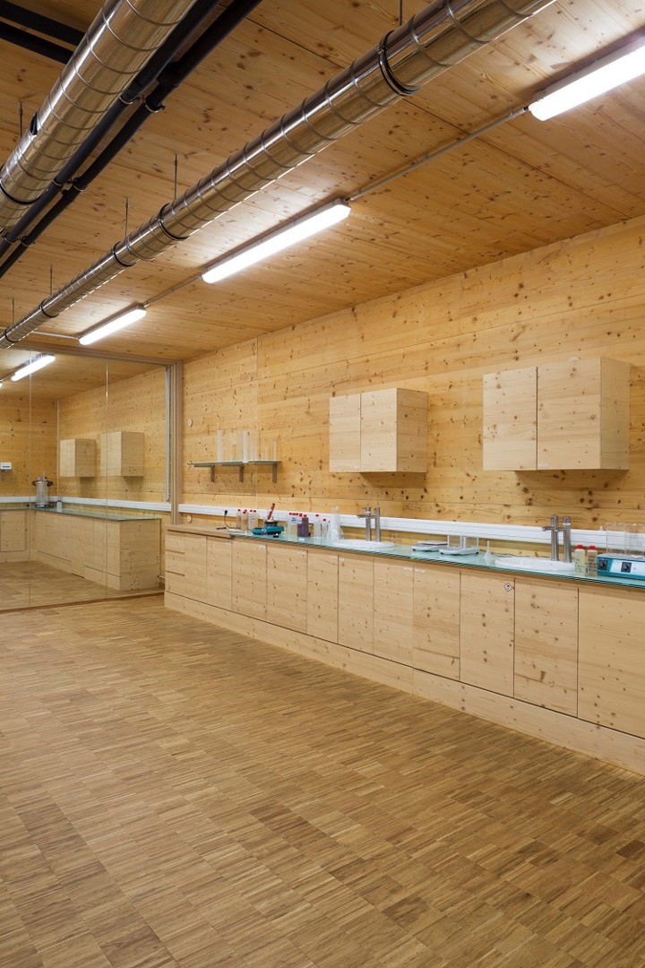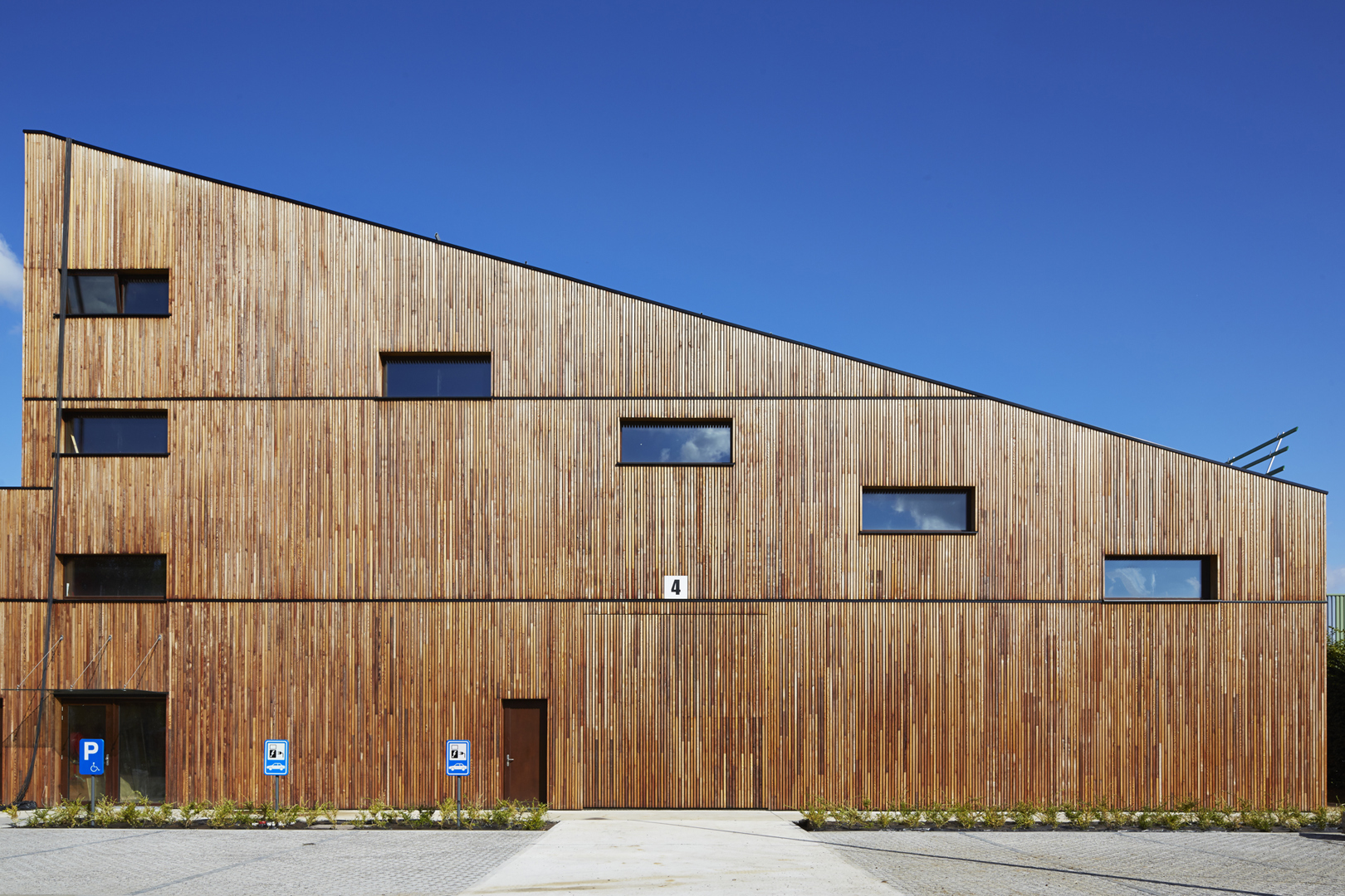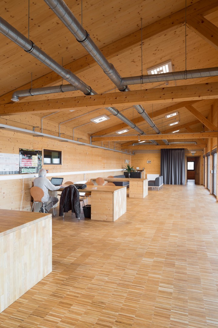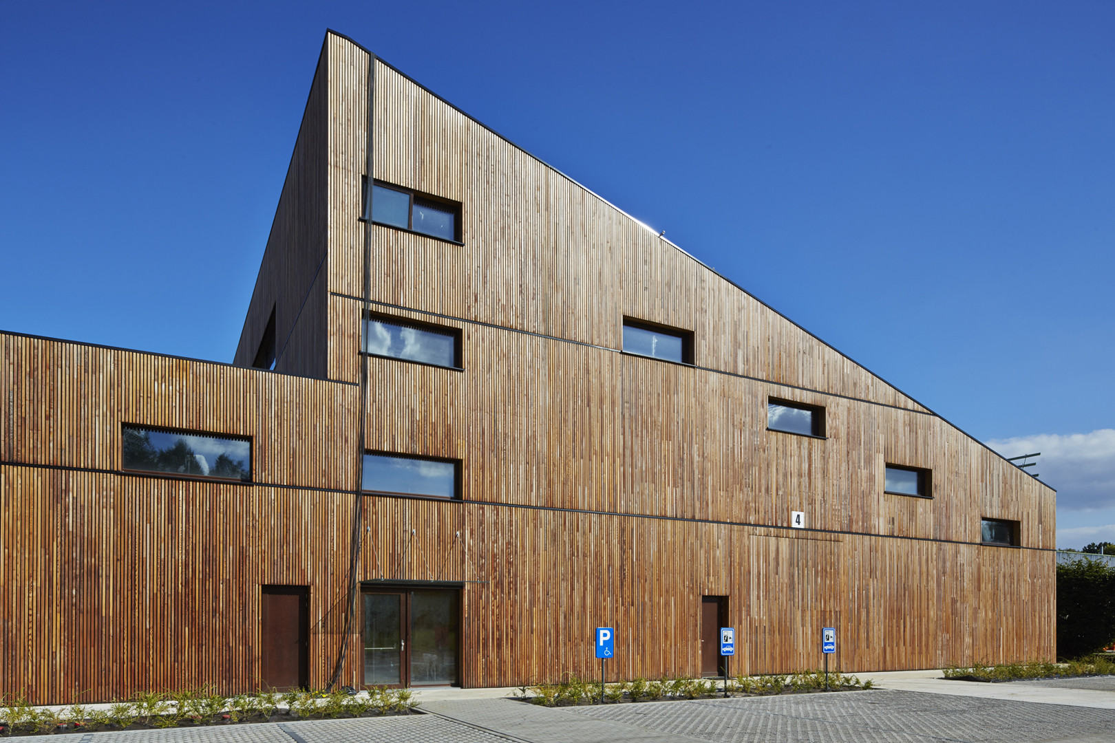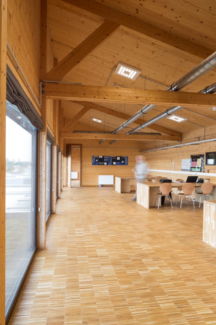 YUGENING (voordien OVG Architecten, red.), met Koen Van Grimbergen als projectarchitect, werd onder de arm genomen en besloot Vandersypen op zijn wenken te bedienen met een doorgedreven circulair gebouw. Zo bestaat het hele gebouw uit een volhouten, demonteerbare constructie. Daarbij werd het onderste uit de kan gehaald, getuige daarvan het feit dat zelfs de liftconstructie in larikshout werd uitgevoerd.