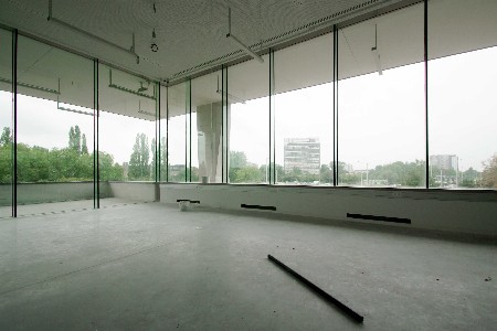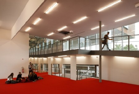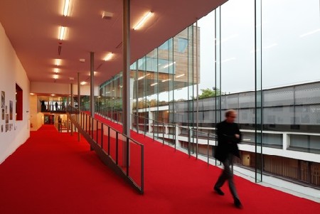 Niet alleen door het materiaalgebruik staat de uitbreiding in contrast met het bestaande volume, maar ook de vormgeving van de uitbreiding zelf is geen directe vertaling of voortzetting van het bestaande gebouw. Tegelijkertijd heeft de uitbreiding ook heel wat gemeen met het bestaande. Zo worden bepaalde belangrijke lijnen verder getrokken: de lijn van de torens wordt verder uitgezet in de achterkant van de uitbouw van de horizontale schijf. De volumewerking refereert op de een of andere manier naar het bestaande gebouw. De volumes van de twee zalen doen je in de cinema aanwezig zijn van de rode en blauwe zaal. De volumewerking zit ook in de rode en de blauwe studio en ook in de horizontale toren zelf. Beel noemt het nog altijd de horizontale toren omdat het een ruimtelijke impact heeft die even groot is als een toren. Het is in feite een antwoord op de andere gebouwen in de omgeving en gaat er een relatie mee aan.