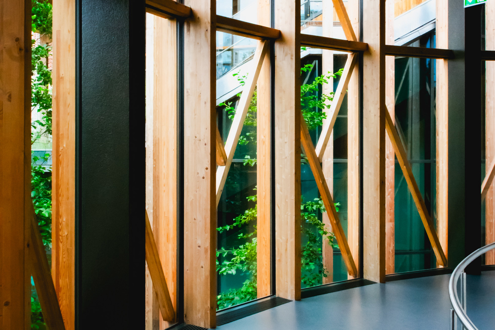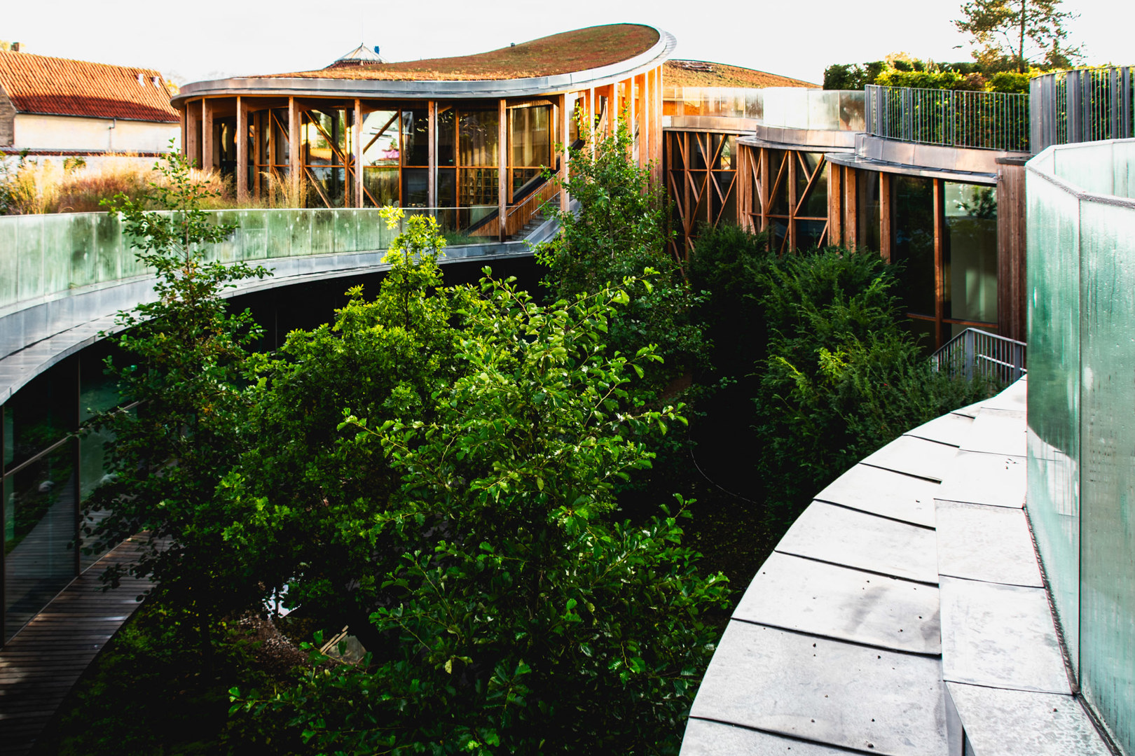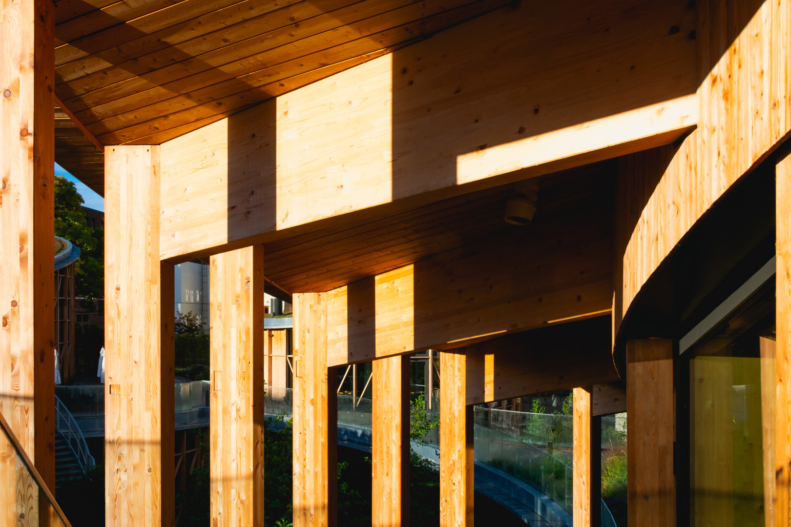 De bovengrondse paviljoenen zijn opgebouwd in een sparrenhoutstructuur, opgevuld met glas en bekleed met dunne lariksbalken. Het hout is zowel in het interieur als in het exterieur in het zicht gelaten. De radiale balken van het plafond simuleren een gevoel onder een boomkruin te lopen.