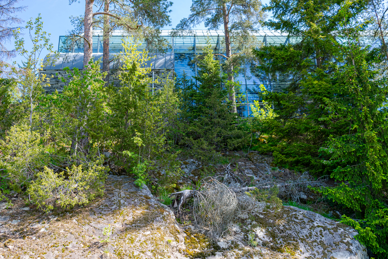 De natuurstenen in de muren zijn zonder mortel gestapeld tot claustra’s. Hun stevigheid voelt ongemakkelijk en contrasteert met de beglaasde wanden. De intensiteit van het daglicht wisselt. Doorzichten verrassen. De natuur is alom aanwezig.