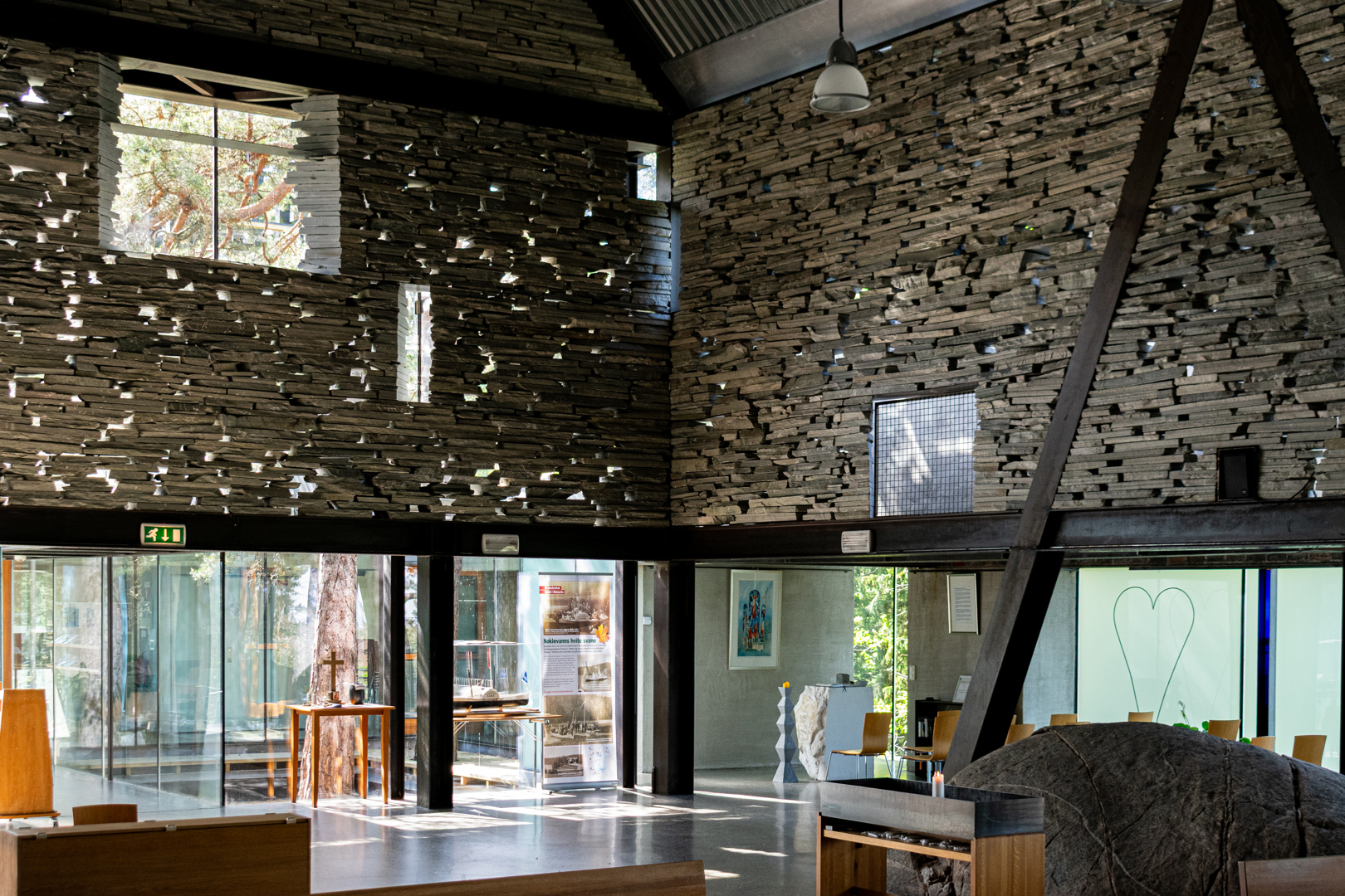 Topografie en vegetatie domineren de beleving. Enerzijds tilt de rots de kerk op, anderzijds slorpt het bos de kerk op. Het licht wordt fijnmazig gefilterd door het gebladerde van de kruinen en de grillige spleten en openingen in de muren. De donkere leisteen versterkt de kleuren van het bos. De grote glasvlakken spiegelen binnen en buiten. De rotsen steken als harige ruggen van prehistorische mammoeten uit de afhellende kerkvloer. In de aanliggende atria ontdubbelen de buitengevels. Bomen groeien er door de paden.