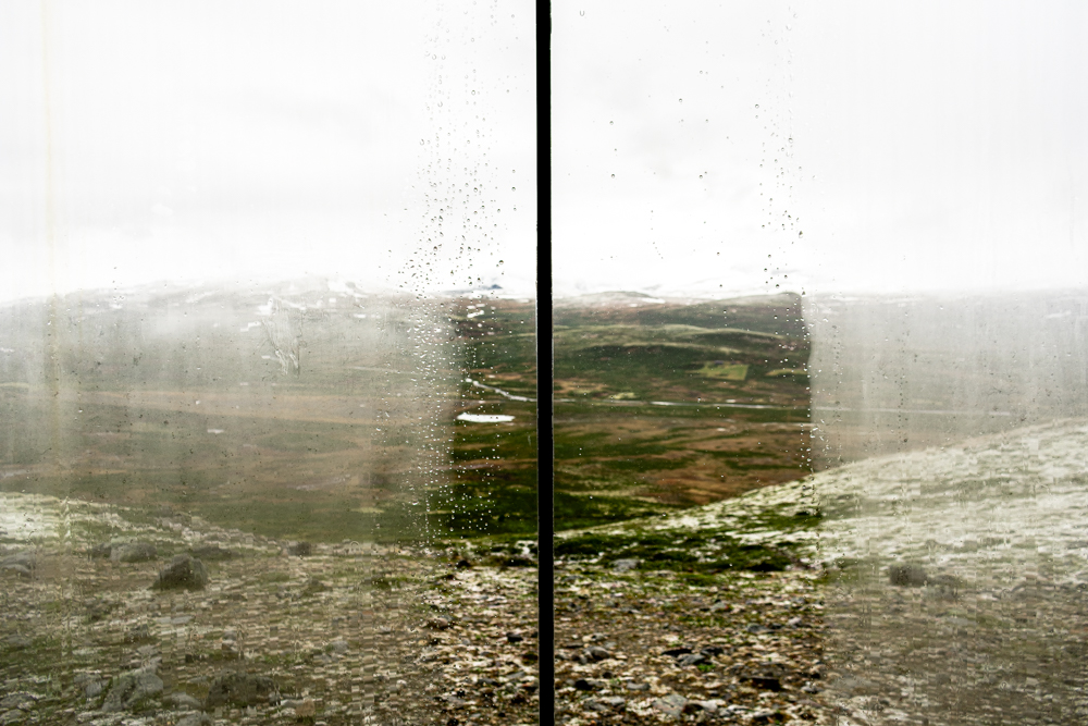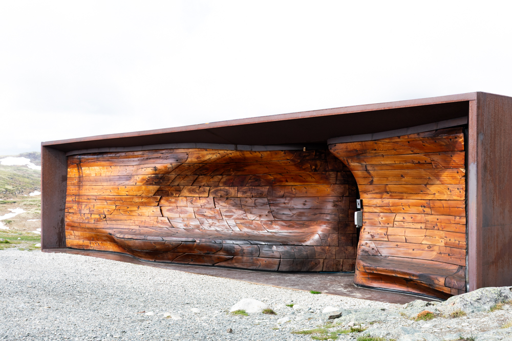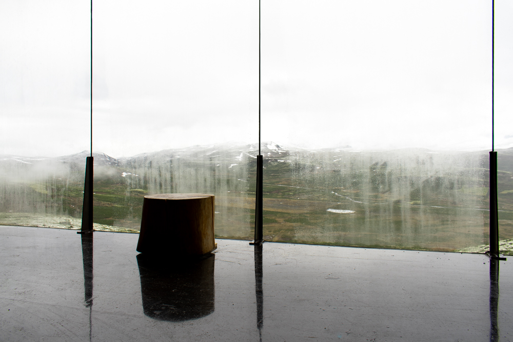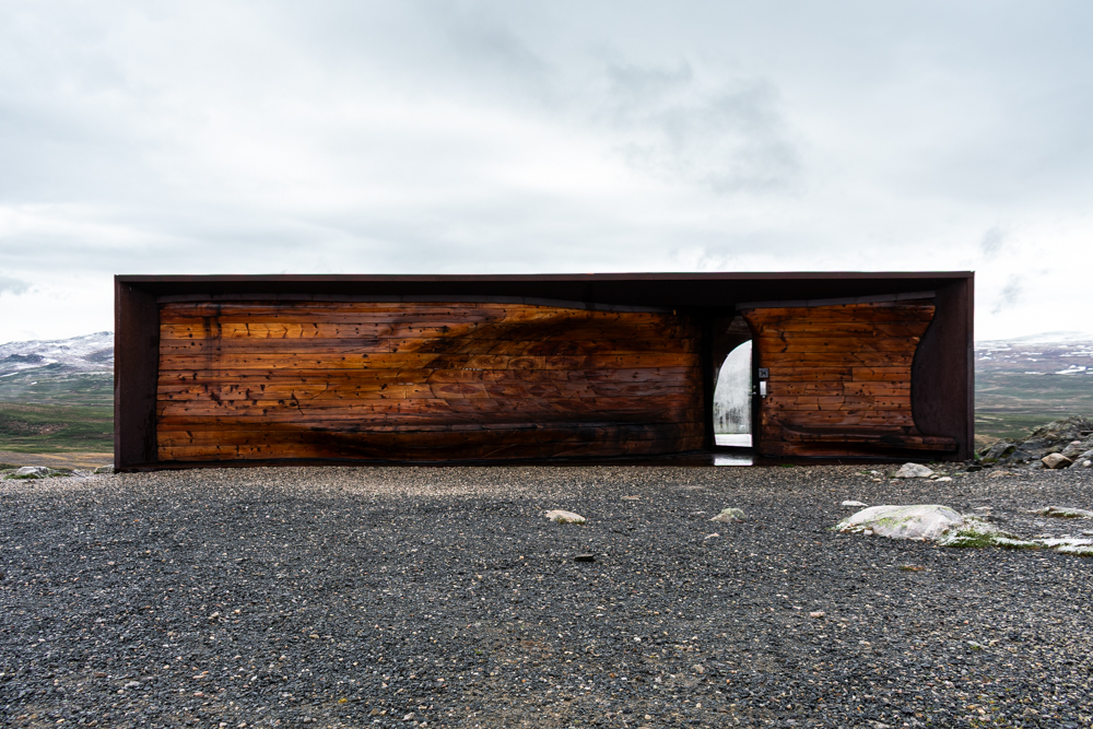 Het is mooi weer. We zijn op weg naar Hjerkinn. We willen wel het Noorse Wild Reindeer Centre Paviljoen bezoeken. Dus we rijden de bergen in. Het weer wisselt snel, maar we willen weten of het de moeite loont om morgen terug te komen. In vrieskou en watersneeuw lopen we het pad van 1,5 km. Verkleumd. We zijn hier niet op aangekleed. Opgelucht zien we het paviljoen 1220 m boven de zeespiegel, opgelucht.