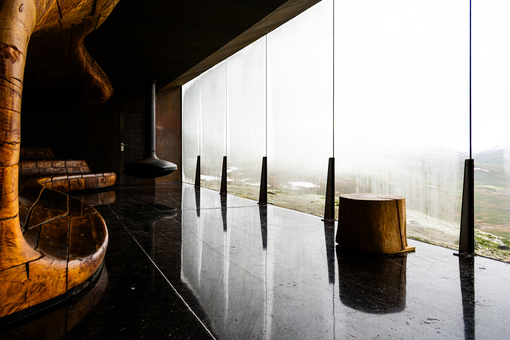 Inderdaad, het paviljoen zit vol contrasten. De cleane balk in een heel weerbarstig klimaat. De stijve buitenschil van ruw staal en zijn zachte organische binnenzijde. De warme, veilige cocon tegenover het koud, wijdopen landschap. De eenzame toeristen in een doodse, winterse stilte.