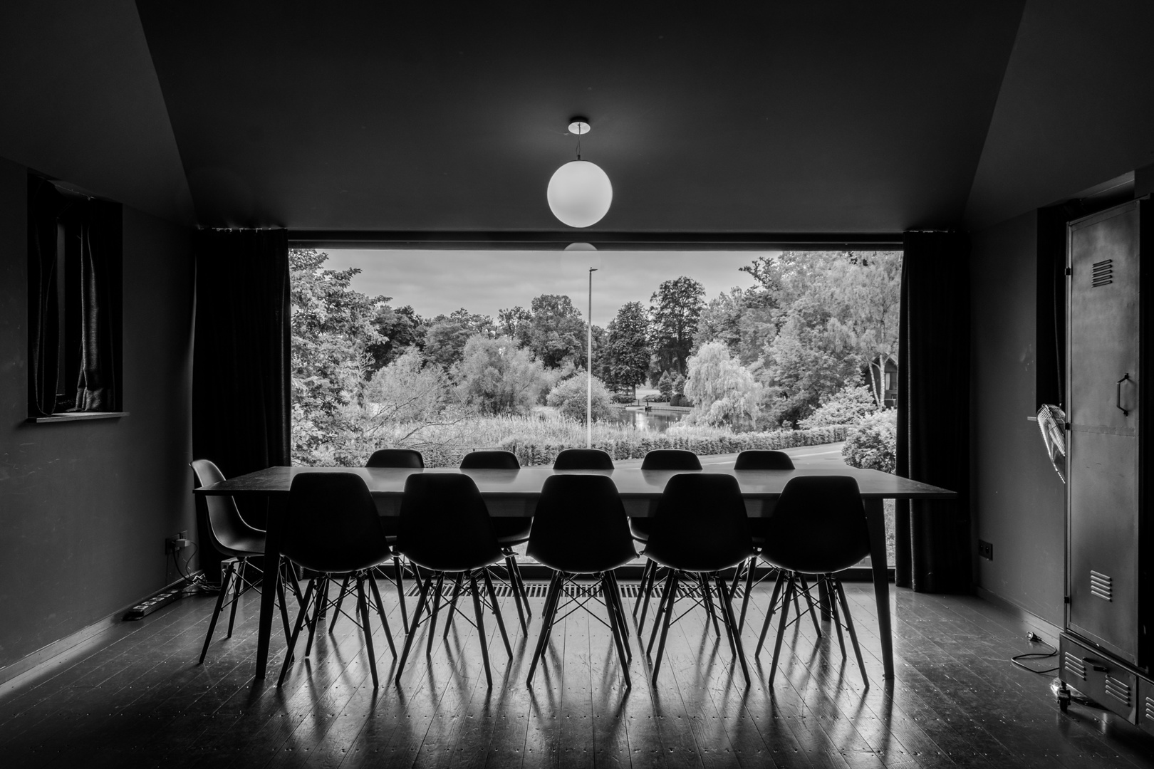Wunderkammer wordt sporadisch gebruikt als artiestenresidentie. In dit zwartgrijs interieur zit op de eerste verdieping de mini-keuken en mini-badkamer verstopt in twee kleine, hoge kokers: helder wit dankzij witopale koepels.