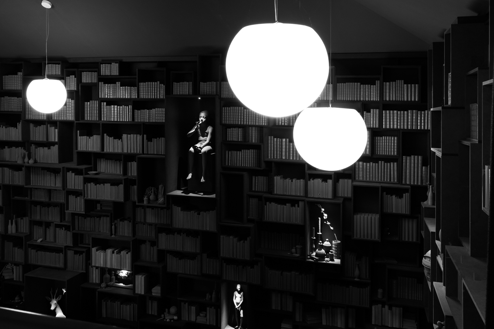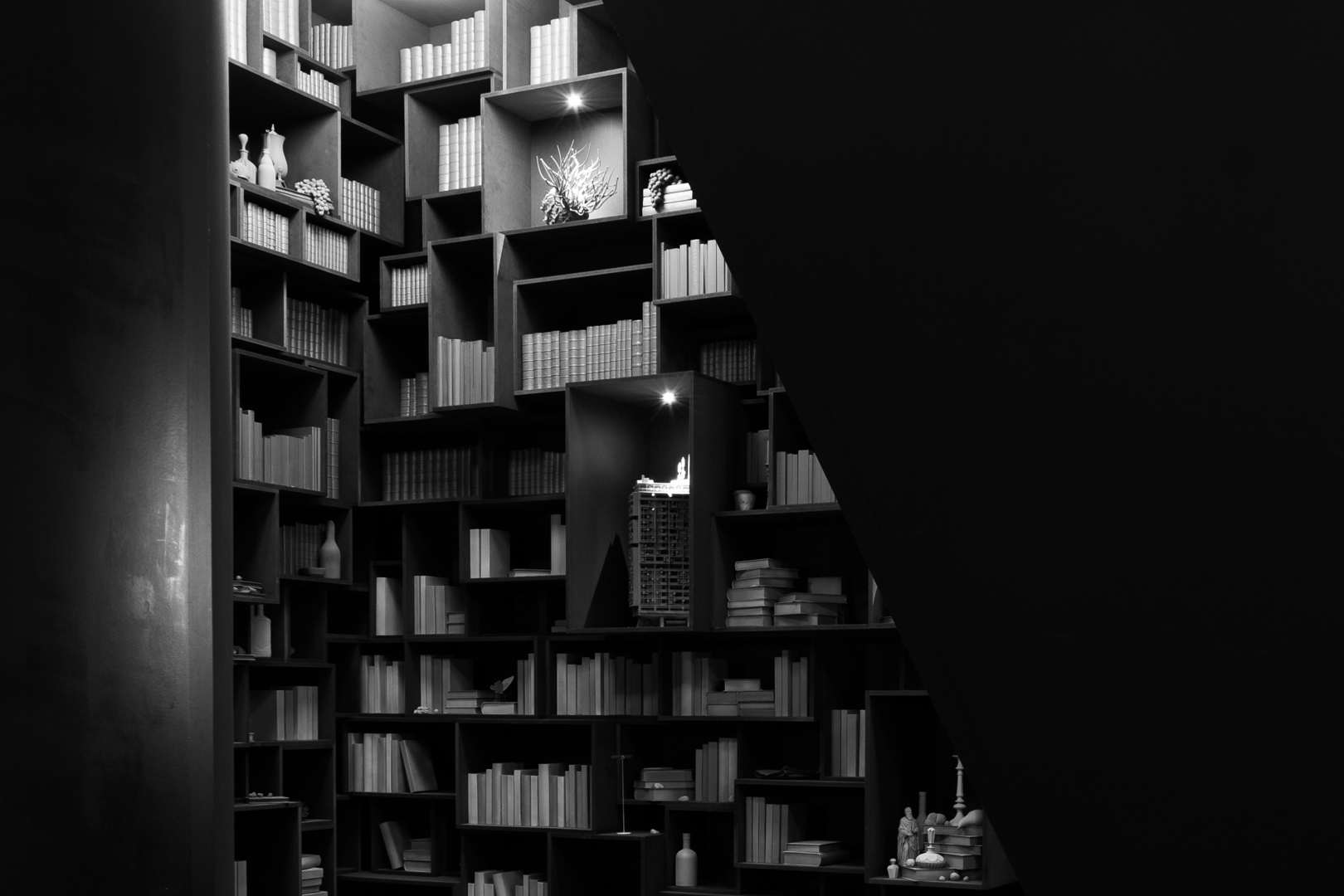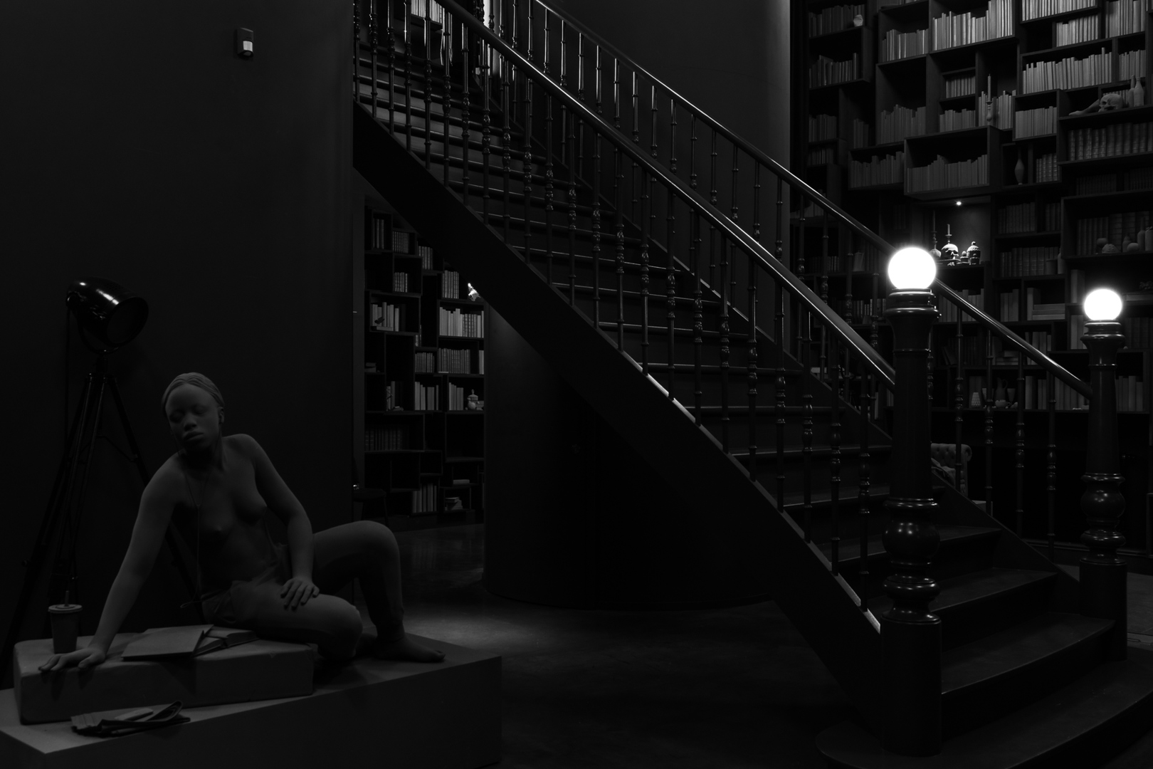 Hans Op de Beeck creëert hier een grootschalige scène. Het werk refereert naar het curiositeitenkabinet: het concept uit de vijftiende eeuw, de voorloper van de openbare musea, de prestigekamer met boeken en werken uit kunst, cultuur en wetenschap. Het interieur is een totaalbeleving: een meditatieve ruimte. Alles in monochroom grijszwart. Alsof onder een dikke laag stof. Het is een wereld op zich. Een mysterieus stilleven. Geheimzinnig. We erkennen de sfeer van de recente tentoonstelling Nachtreis in het KMSKA waar Hans Op de Beeck kleinere scènes presenteert. Bevreemdend. Dromerig.