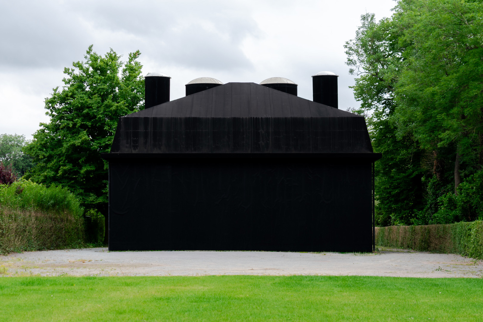 Wunderkammer staat er als een zwarte monoliet: monumentaal, tijdloos, abstract, introvert. We vinden de zwarte voordeur tussen de twee zwarte zuiltjes. Wunderkammer trekt ons binnen.