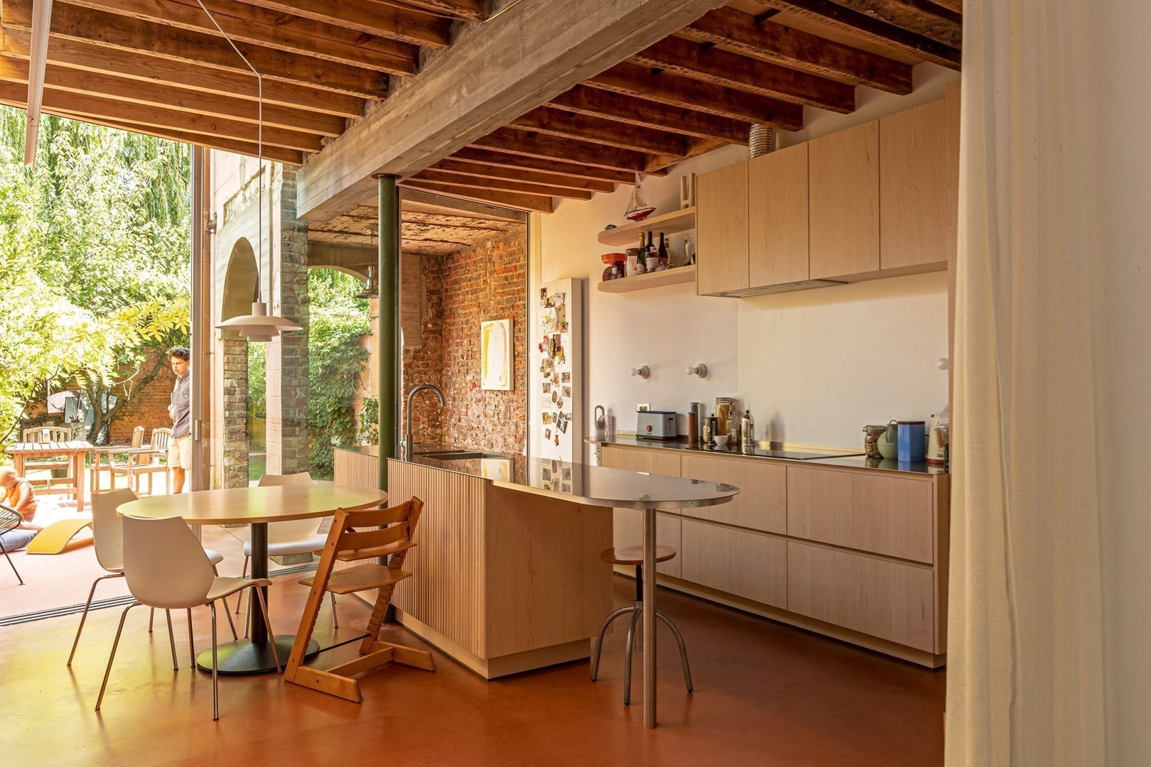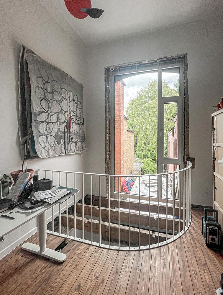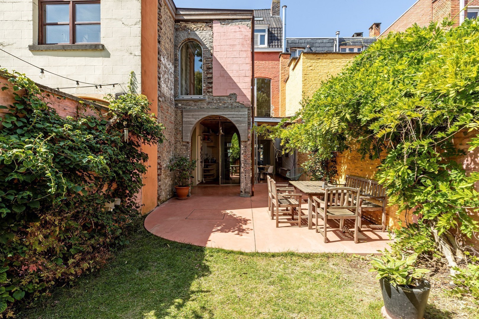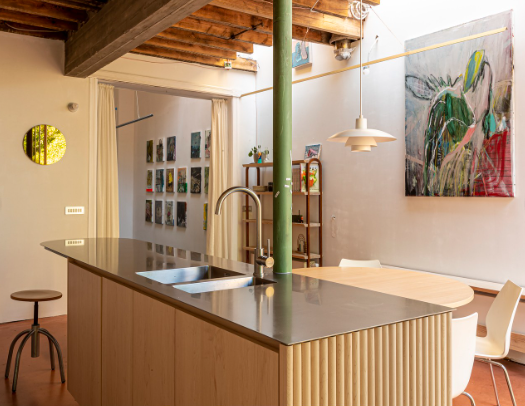 Het paar had de charmevolle herenwoning begin 2020 aangekocht. De renovatie was nodig om de woning te optimaliseren, maar ook om meer daglicht binnen te trekken. Het vernieuwingsproject mocht gedurfd zijn, maar er was slechts een beperkt budget voorhanden. Het huis kreeg uiteindelijk een nieuwe achtergevel, een nieuwe keuken en, naast de keuken, een galerieruimte (MAST art gallery) die het koppel zelf zou gaan uitbaten. Ook werd de band met de tuin versterkt.