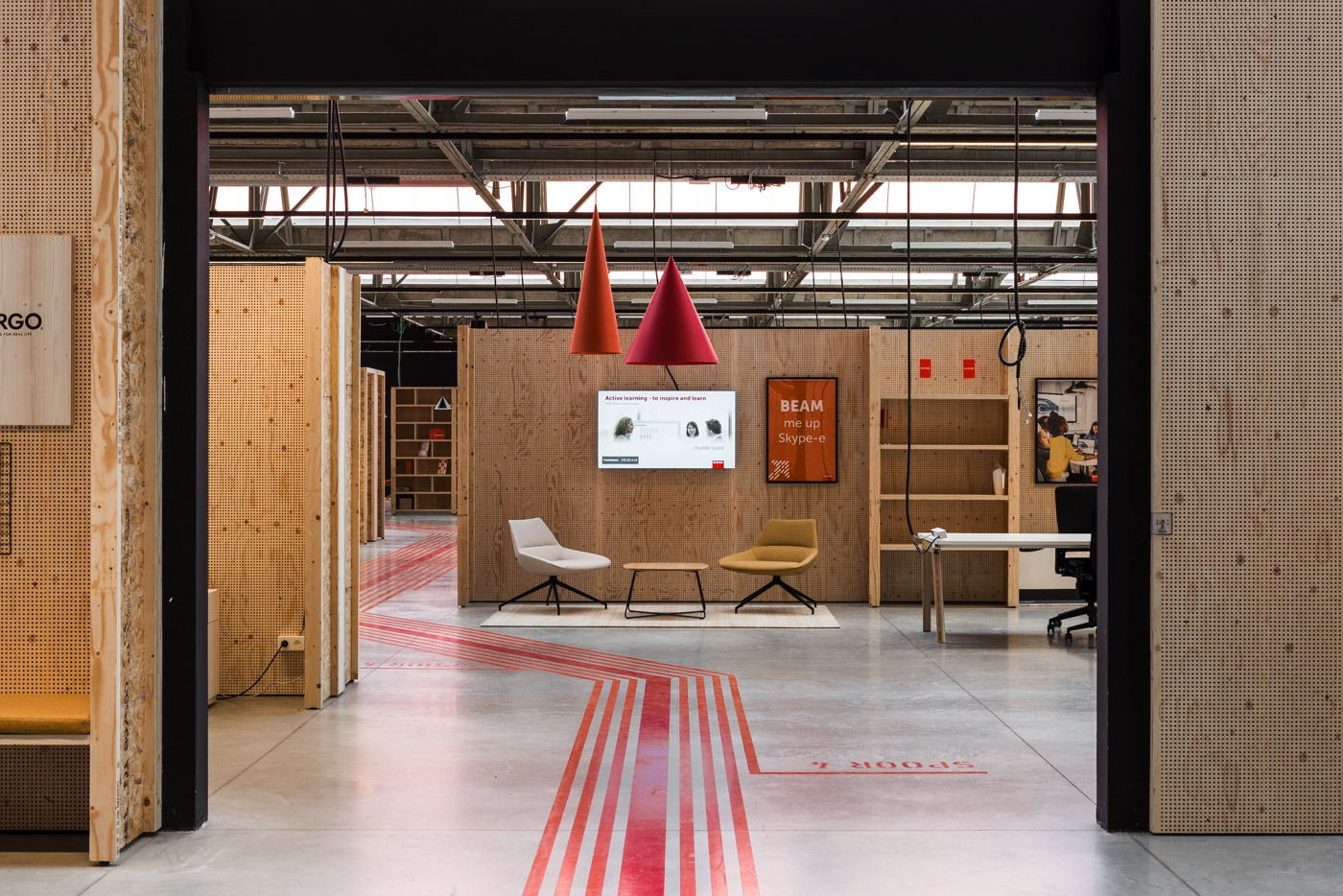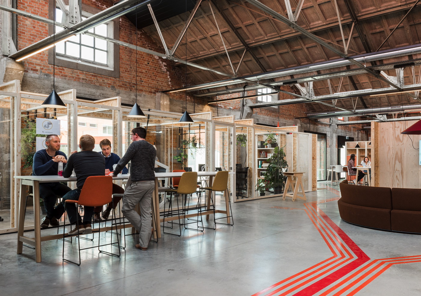Dwars door de flexibele kantoorruimtes loopt een ‘gidsend spoor’ dat – naast de verscheidene werkplekken van elkaar scheiden - informele ontmoetingen met andere ondernemers aanmoedigt. Om deze functie nog extra te stimuleren, werden onder meer kitchenettes, zithoeken en printlokalen langs het spoor geplaatst.