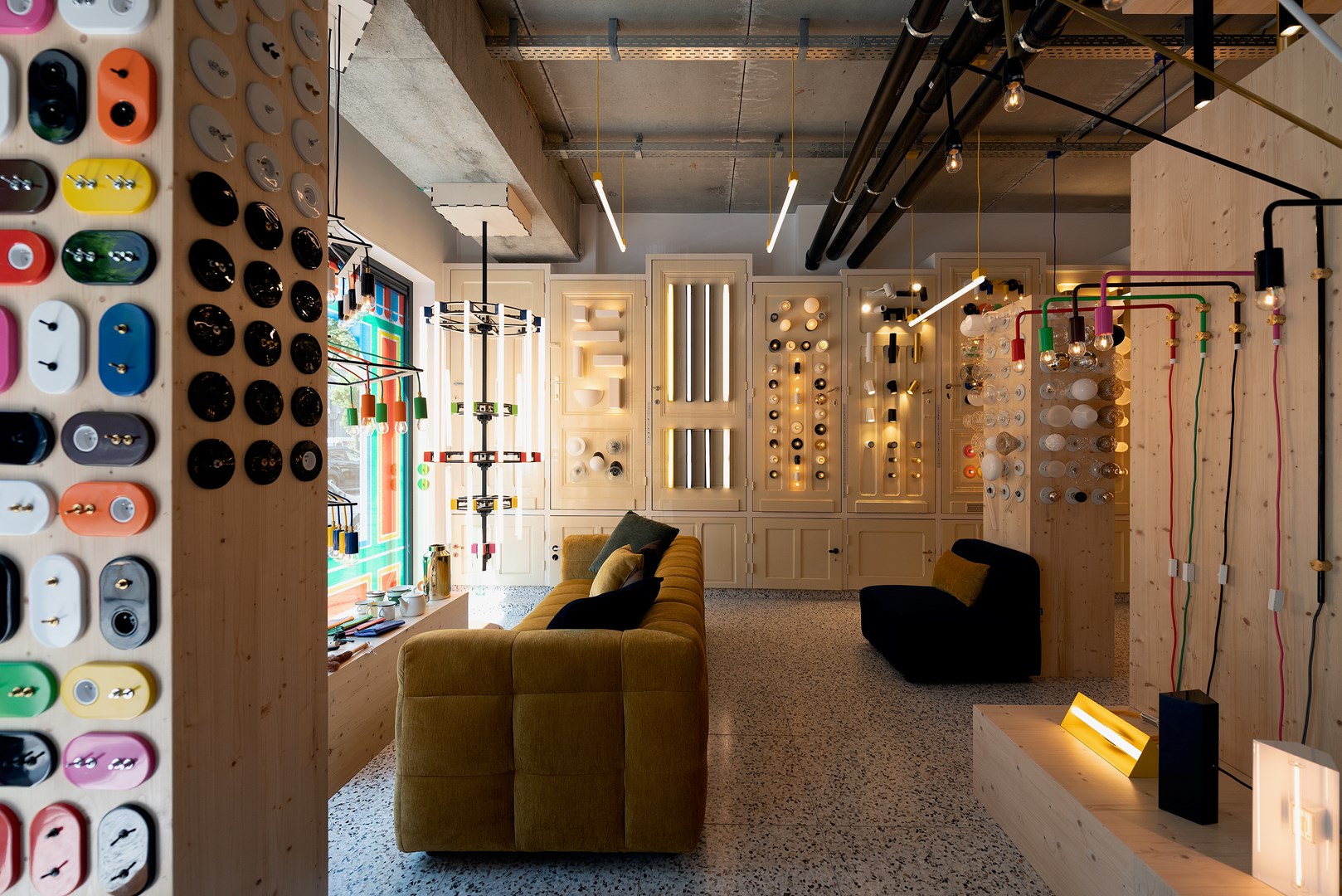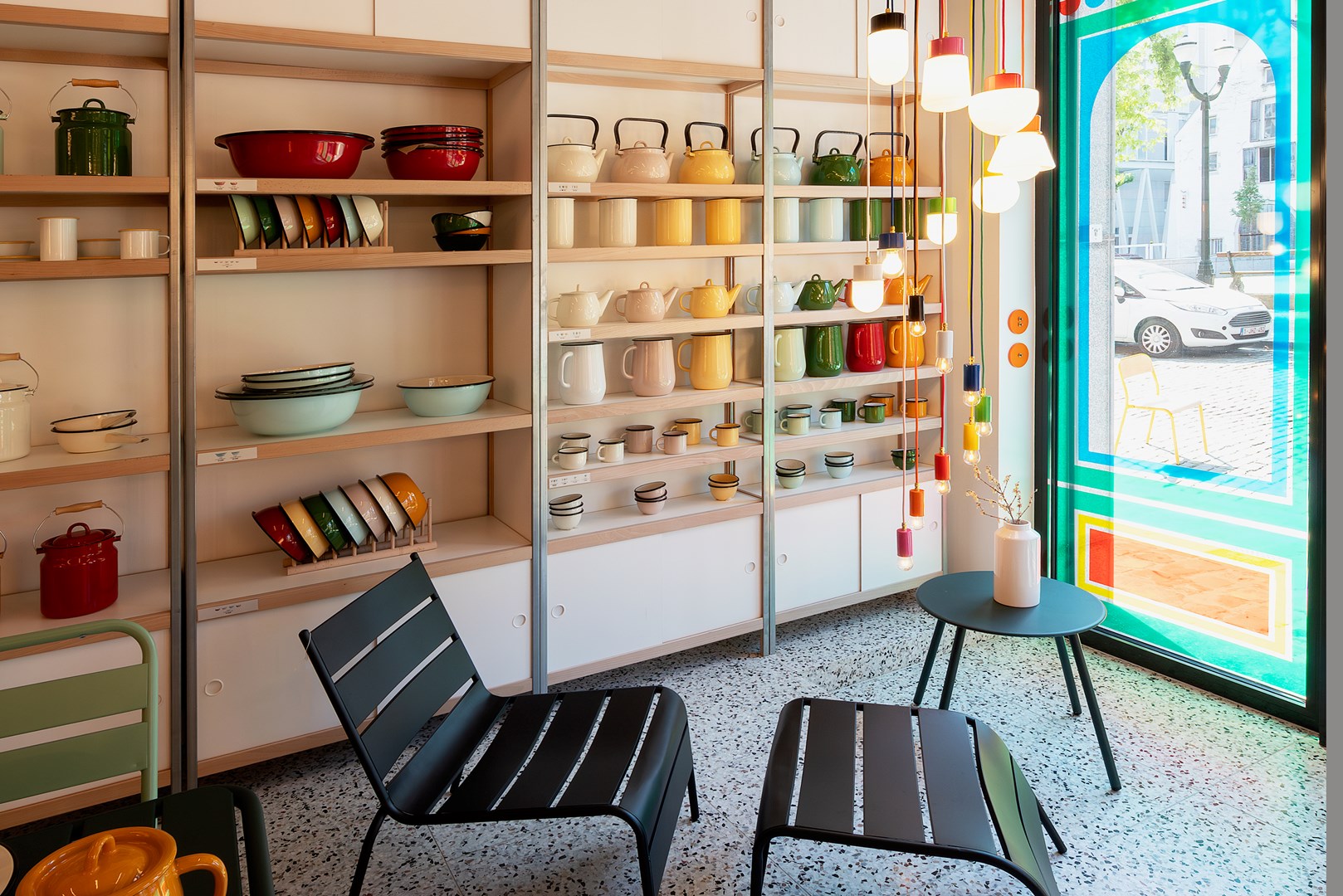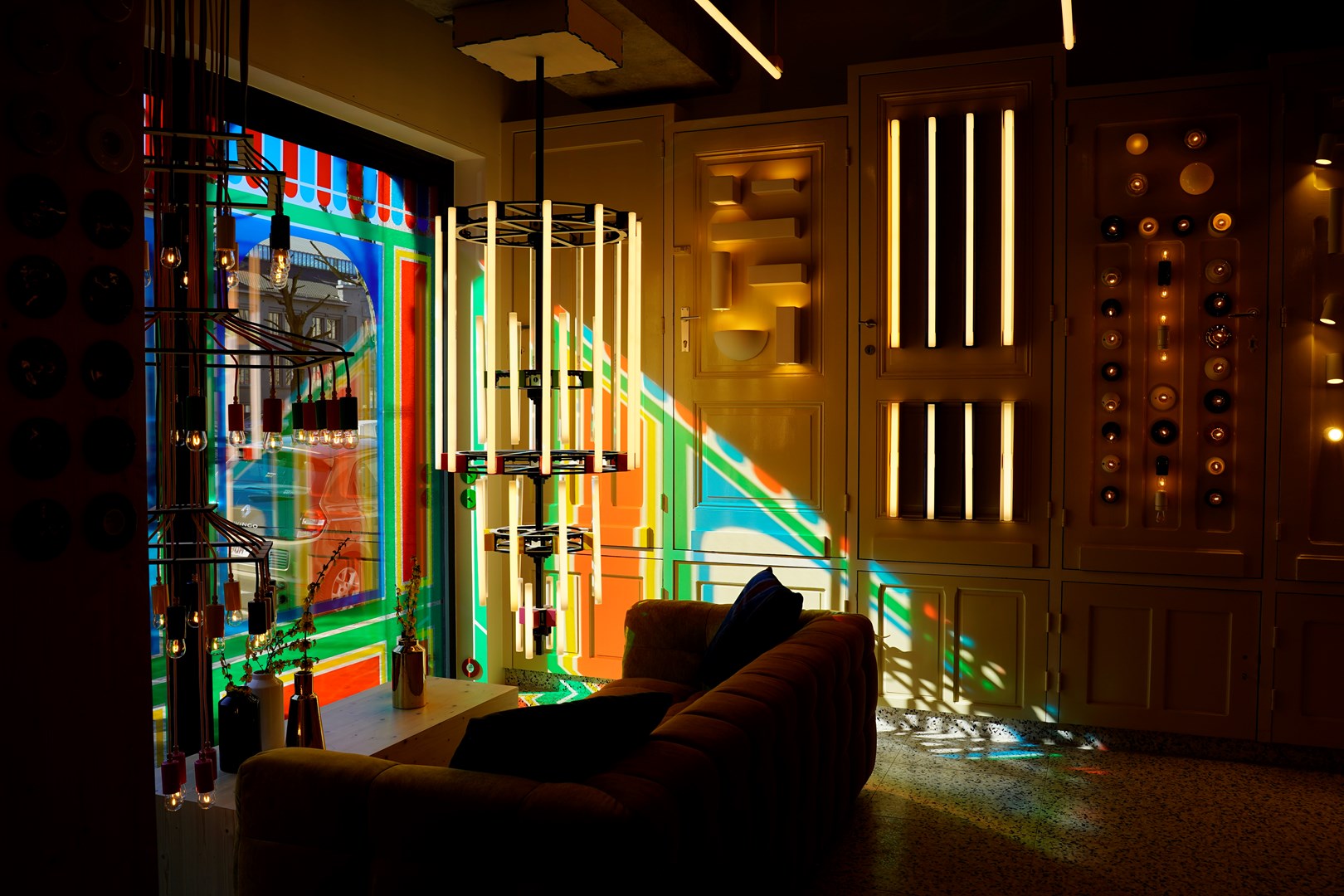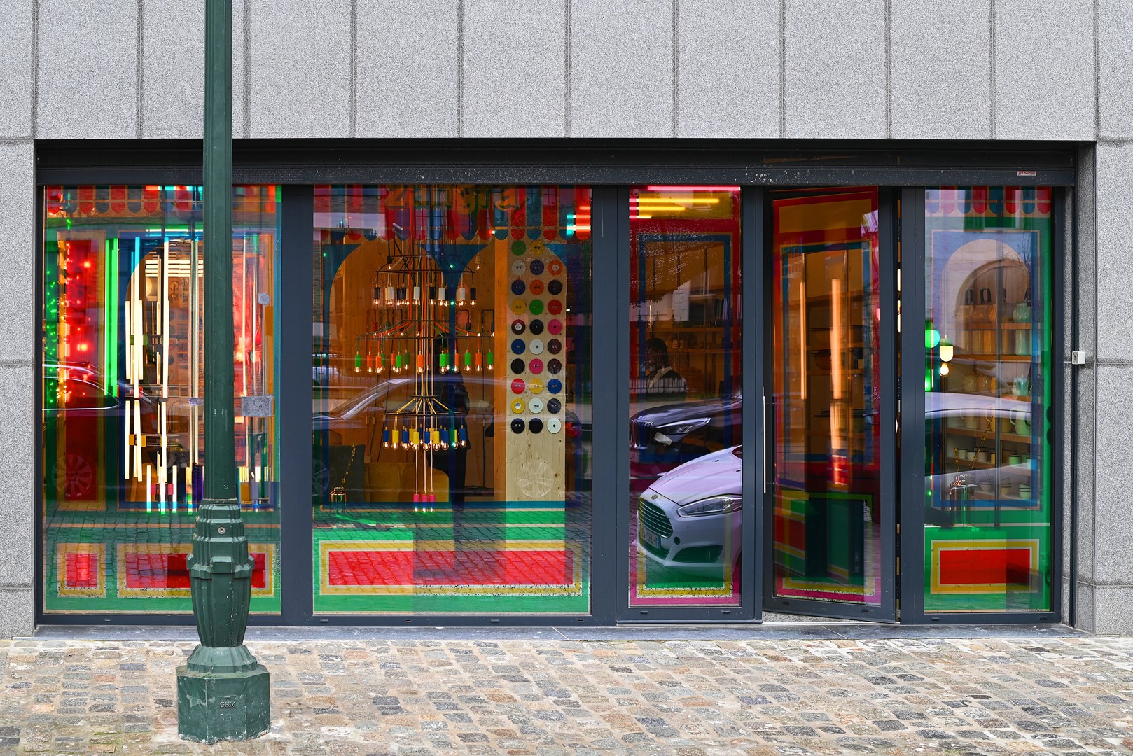 De Nederlandse grafisch kunstenaar Nynke Tynagel transformeerde de etalage in een modern glas-in-loodraam dat bij zonnig weer voor een prachtig kleurenspel in de winkel zorgt. Om het raam te decoreren gaf zangra carte blanche aan Nynke, die bekend staat om haar eclectische composities met iconische alledaagse voorwerpen. Meestal maakt ze grafische kunst, maar speciaal voor zangra ontwierp ze drie majestueuze kroonluchters door zangra-lichtcomponenten te combineren.