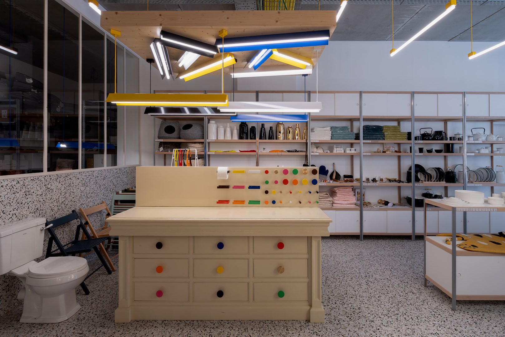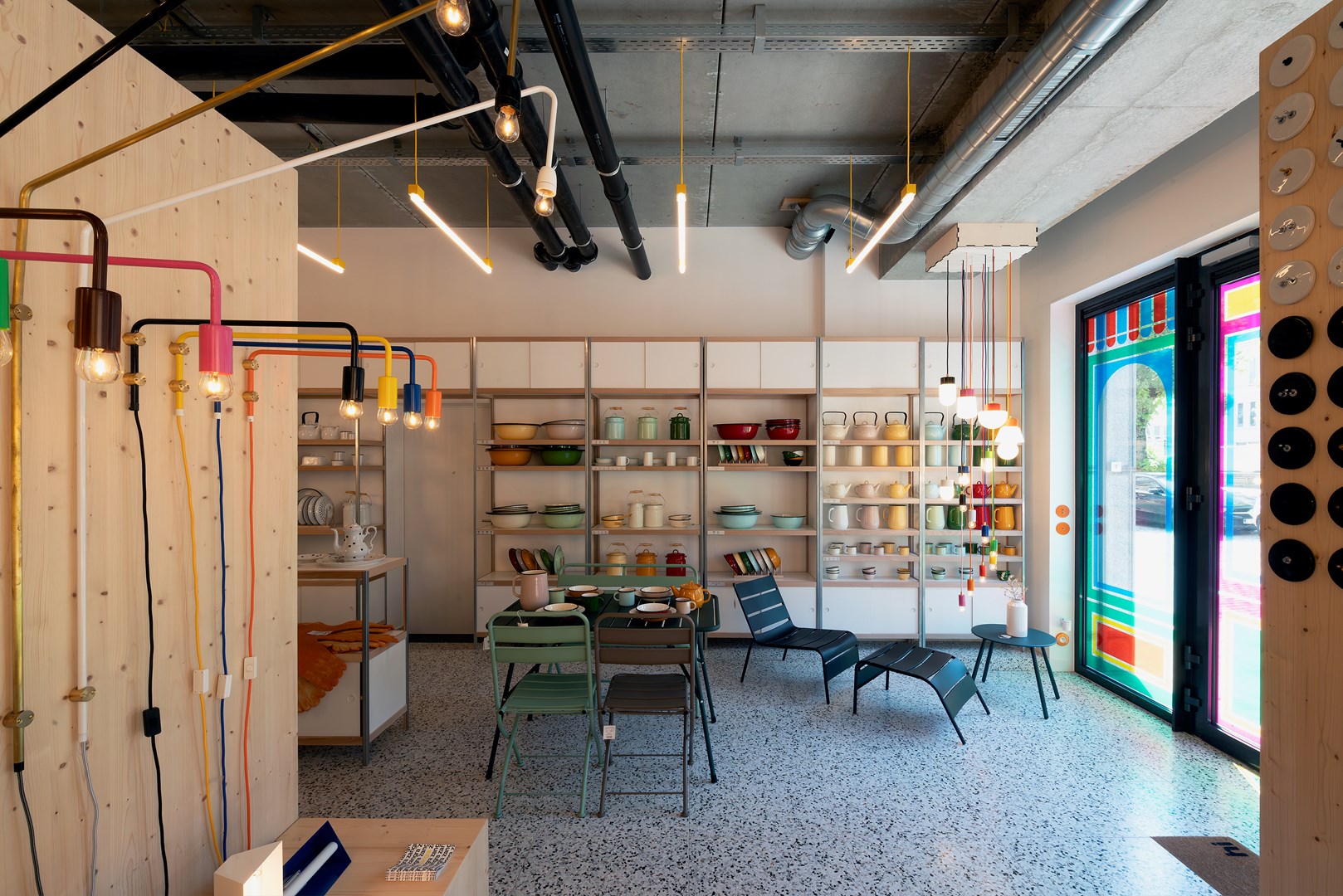 Naast de kleurrijke ontwerpen van Nynke zijn er ook twee lange wandkasten van voor naar achter in de winkel: één met de hand gemaakt met vintage deuren en de andere een 12 meter lange kast gemaakt met Kewlox-componenten. Kewlox is een echt Belgisch designicoon dat gespecialiseerd is in opbergoplossingen. De gerenommeerde ontwerper Julien Renault is verantwoordelijk voor de re-branding en de productontwikkeling van Kewlox.
