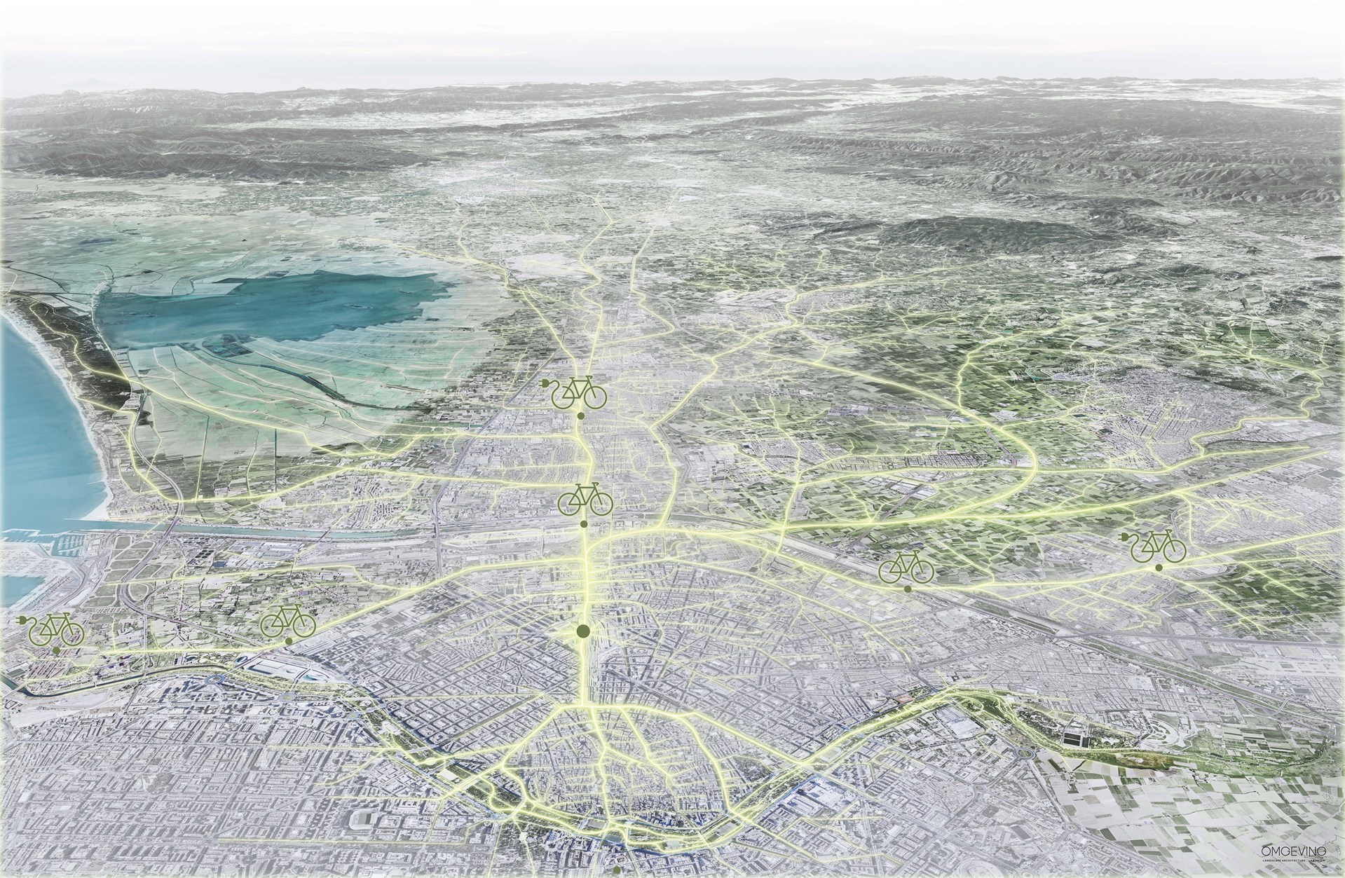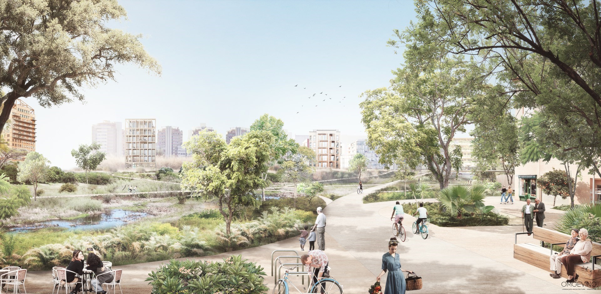 Nieuwe fiets- en wandelpaden brengen inwoners via de groene nerven in 15 minuten tot het centrum van de stad. Daarmee zet ook het zuidelijke deel van Valencia de modal shift in naar minder autoverkeer. De drie ecowijken zijn verknoopt met dit groenblauw mobiliteitsnetwerk en staan aan het front van de klimaattransitie. De herontwikkeling van dit stadsdeel zet volop in op duurzame mobiliteit, klimaatadaptie, biodiversiteit, CO2 neutraliteit, circulariteit en betaalbaar wonen. Valencia doopte het ambitieuze stadsontwikkelingsproject ‘The green corridor’, een naam die de ontwerpers van OMGEVING met hun winnende voorstel alle eer aandoen.