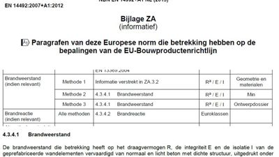 Verklaart de fabrikant de brandweerstand onder methode 2, dan verwijst de bijlage ZA dikwijls naar de paragraaf 4.3.4.1 van de productnorm (zie onder), die op zijn beurt doorverwijst naar de gelijk genummerde paragraaf van de NBN EN 13369 – “Algemene bepalingen voor vooraf vervaardigde betonproducten”.