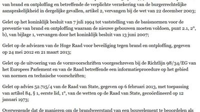 Eén van de eerste zinnen van deze wettekst begint als volgt: “Overwegende dat de manieren om de brandweerstand van een bouwelement te beoordelen als de CE-markering niet verplicht is, bepaald worden in het punt 2.1, 2° van de bijlage 1 van het koninklijk besluit van 7 juli 1994 en dat één van die middelen een berekeningsnota is, uitgewerkt volgens een erkende berekeningsmethode;…”