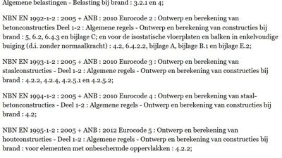 De “NBN EN 1168 – Holle vloerelementen” die in bijlage G bijkomende bepalingen voor het nazicht van de dwarskrachtweerstand bij voorgespannen holle vloerelementen bij brand geeft.