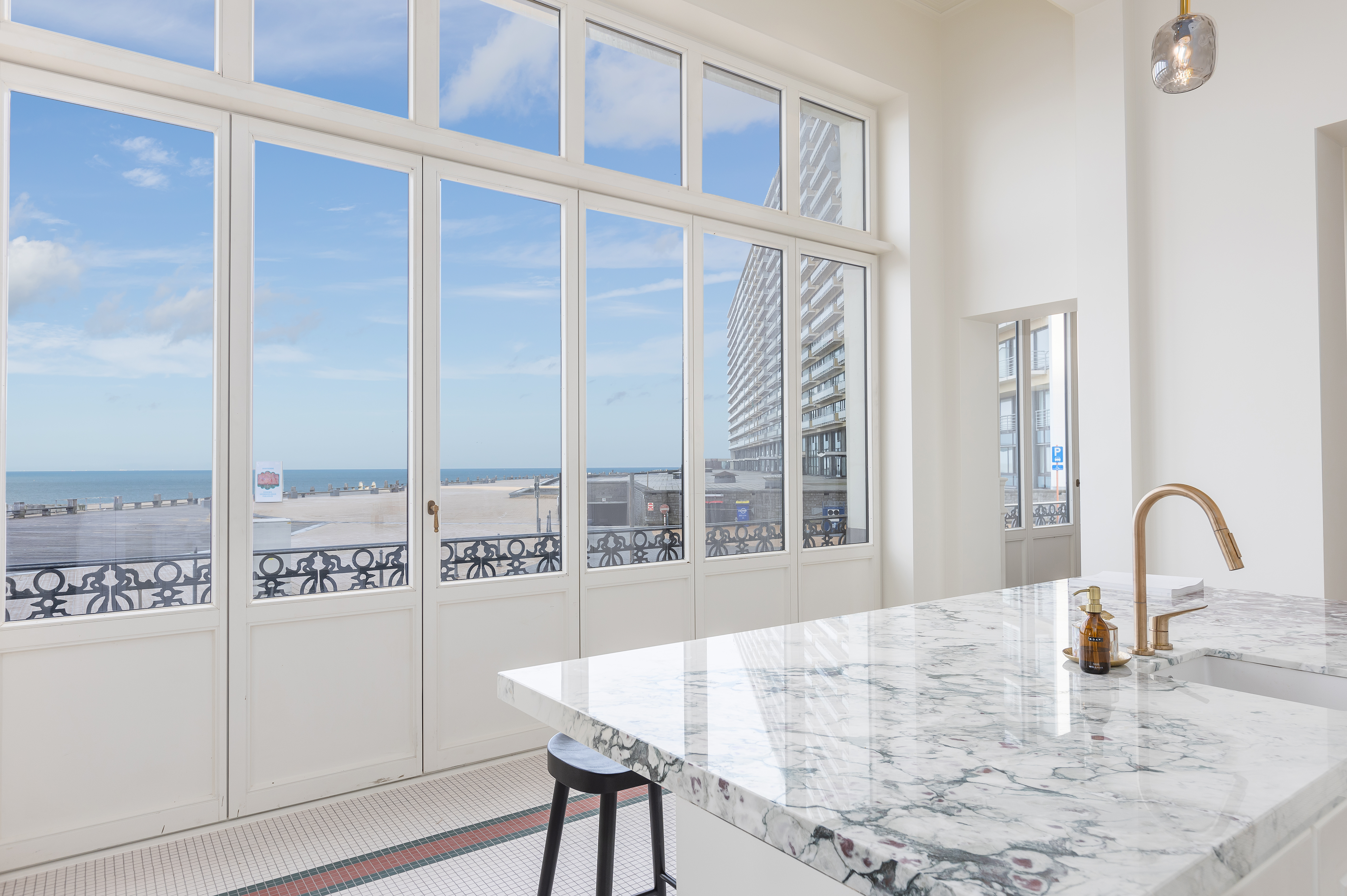 Bovenaan is de volledige kroonlijst gereconstrueerd in witsteen. Origineel werd hiervoor een Franse, poreuze witte kalksteen gebruikt. Maar in combinatie met het zilte zeeklimaat, was dit niet de meest duurzame keuze. De drie voormalige zeedijkvilla’s zijn gerestaureerd. De gebouwen die ná de Tweede Wereldoorlog werden toegevoegd door de Katholieke Hogeschool Oostende-Brugge werden gesloopt. De woontoren is helemaal nieuw.